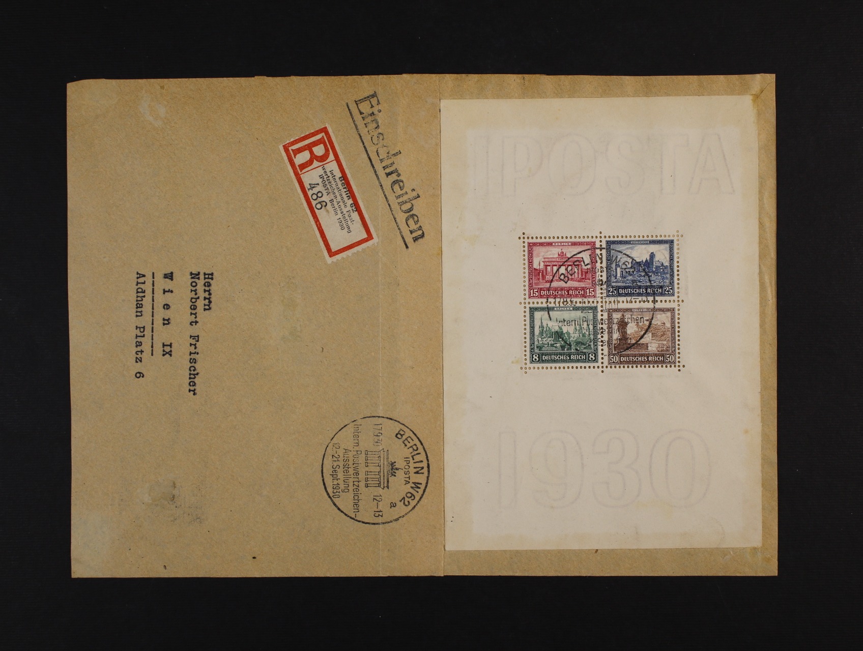 1658 R-dopis do Vídně frank. Bl. Mi. 1 IPOSTA 1930 s pod. výstavním raz. BERLIN W 62 IPOSTA 17.9.30, dopis rozstřižen a horní stranou slepen, kat. cena jen raz. aršík 2000 EUR 8000