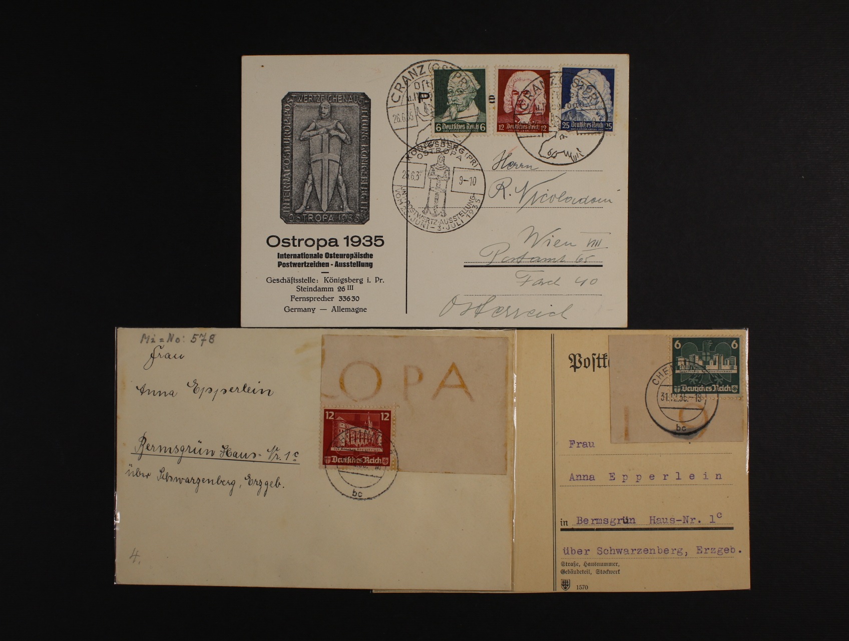 1659 propag. KL s rekl. přítiskem OSTROPA 1935 frank. zn. Mi. č. 573 - 5 s výstavním raz. a KL frank. zn. z aršíku Mi. 577 a dopis frank. zn. z aršíku Mi. 578 s raz. CHEMNITZ 31.12.35, cca 300 EUR 1000