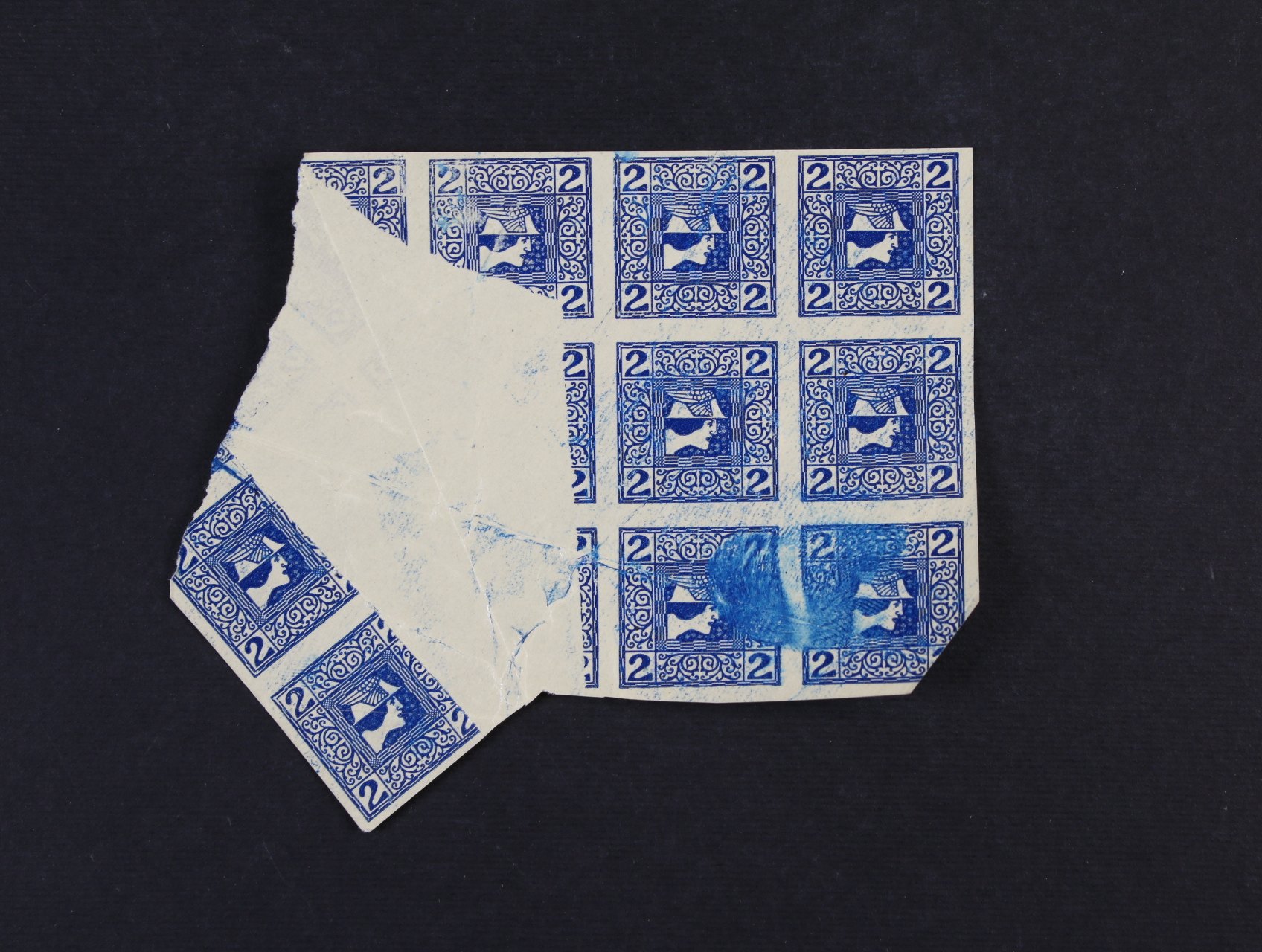 zn. Fe. č. 157 2h modrá Merkur vpravo v 9ti-bloku s přeložkou a tiskem na lepu, velmi zajímavé