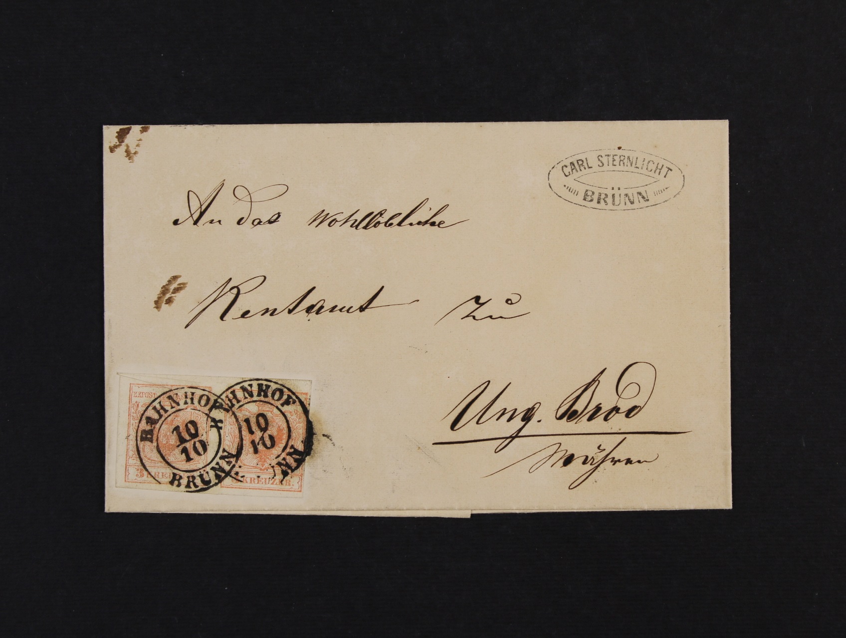 skl. dopis z r. 1857 frank. zn. Fe. č. 10 IIa (2x), pod. raz. BRÜNN 10.12., zk. a atest s označením R Ferchenbauer, 1700 EUR