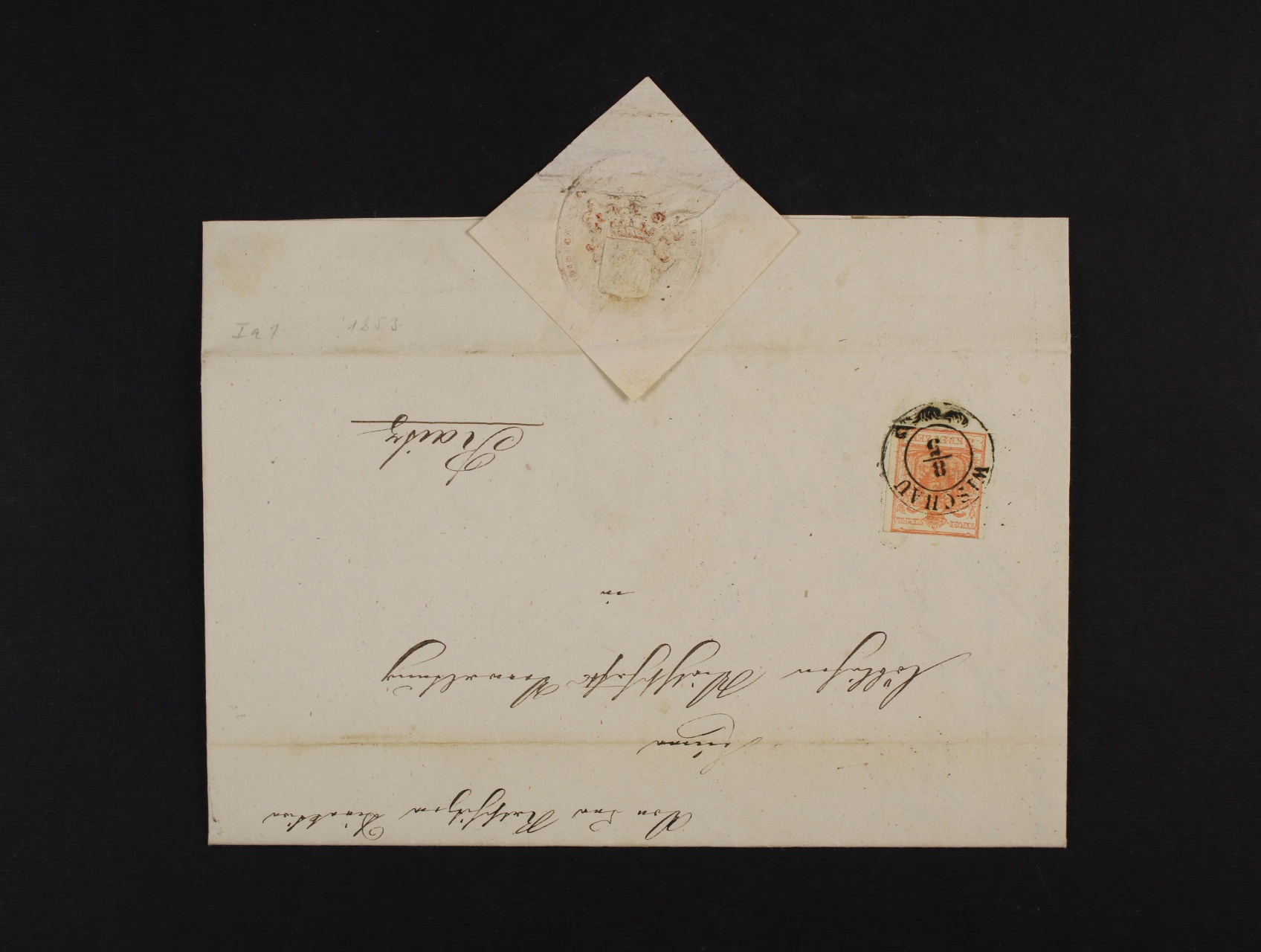 skl. dopis do Rájce z r. 1853 frank. zn. Fe. č. 3 HP, typ I s dvoukruh. pod. raz. WISCHAU 8.5. + průch. raz. BRNO, BLANSKO, neporušená papírová reliéfní pečeť, zajímavé