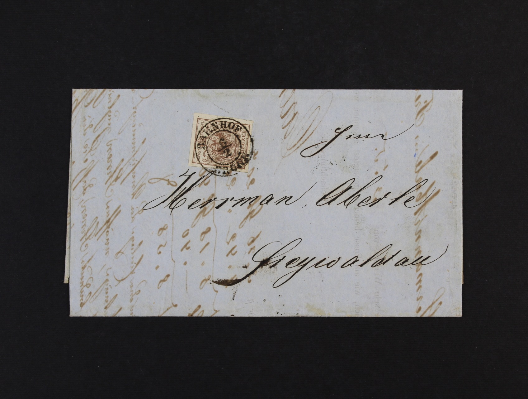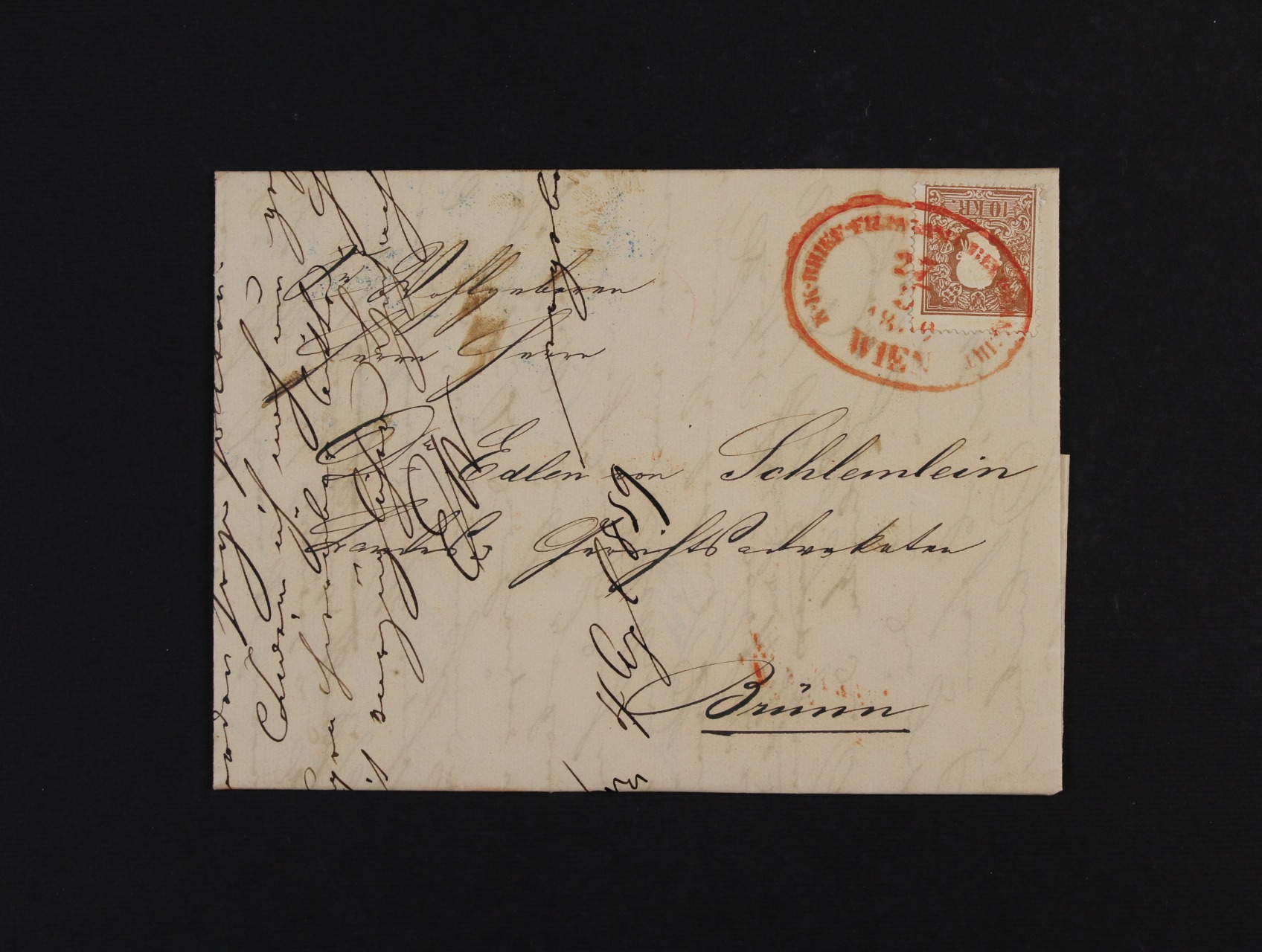 skl. firemní dopis do Uherského Brodu frank. z. Fe. č. 3 s gravurou, při oddělování zn. poštmistrem nastřiženo šikmo v horní části zn., pod. dvoukruh. raz. BAHNHOF BRÜNN 10.10. + oválné firemní raz. a na zadní str. průchozí raz. B. H. LUNDENBURG, přích. raz.