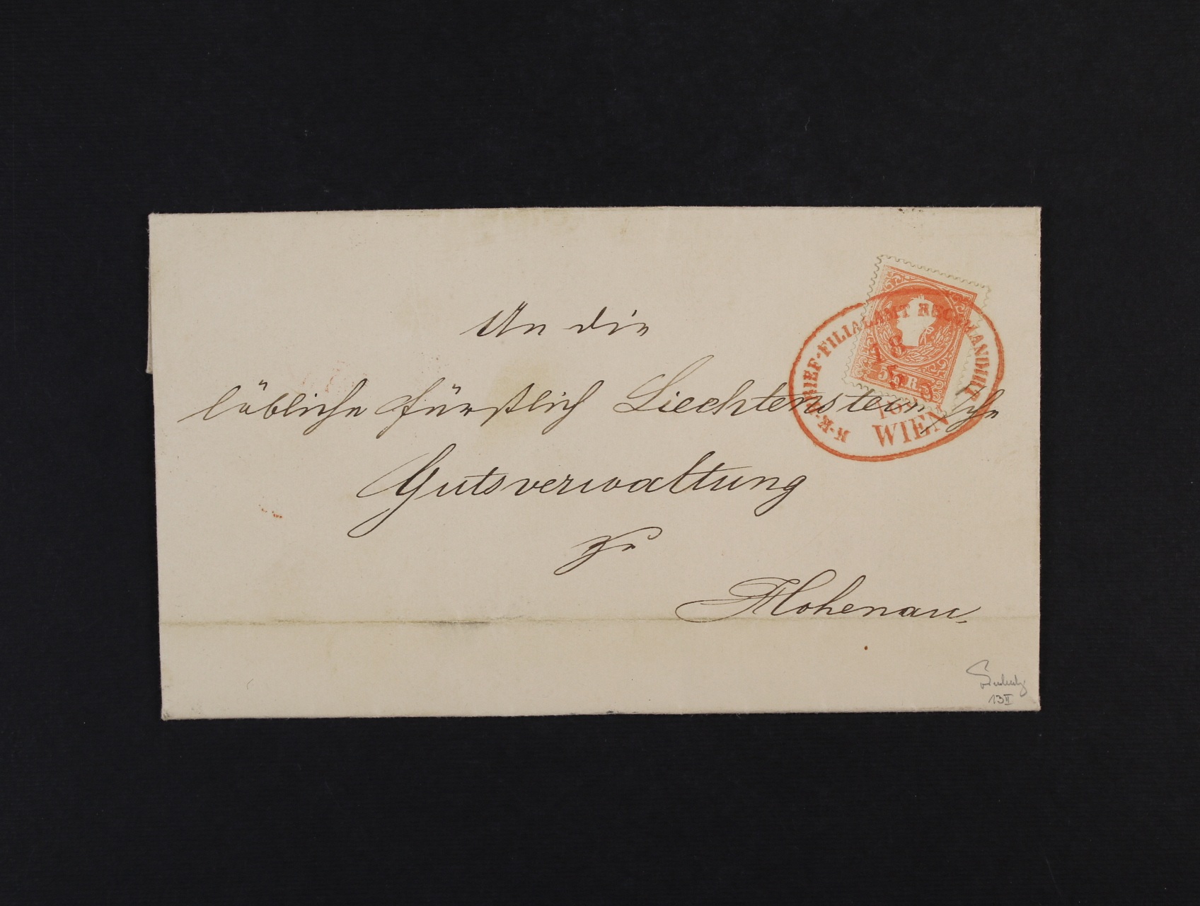 skl. R-dopis z r. 1860 do Hohenau frank. zn. Fe. č. 13 II s pod. oválným červeným raz. K.K. BRIEF-FILLAMT RECOMANDIRT WIEN 18.5.1860, při otevírání na zadní str. stržená zn., přích. raz., zk. Ferchenbauer