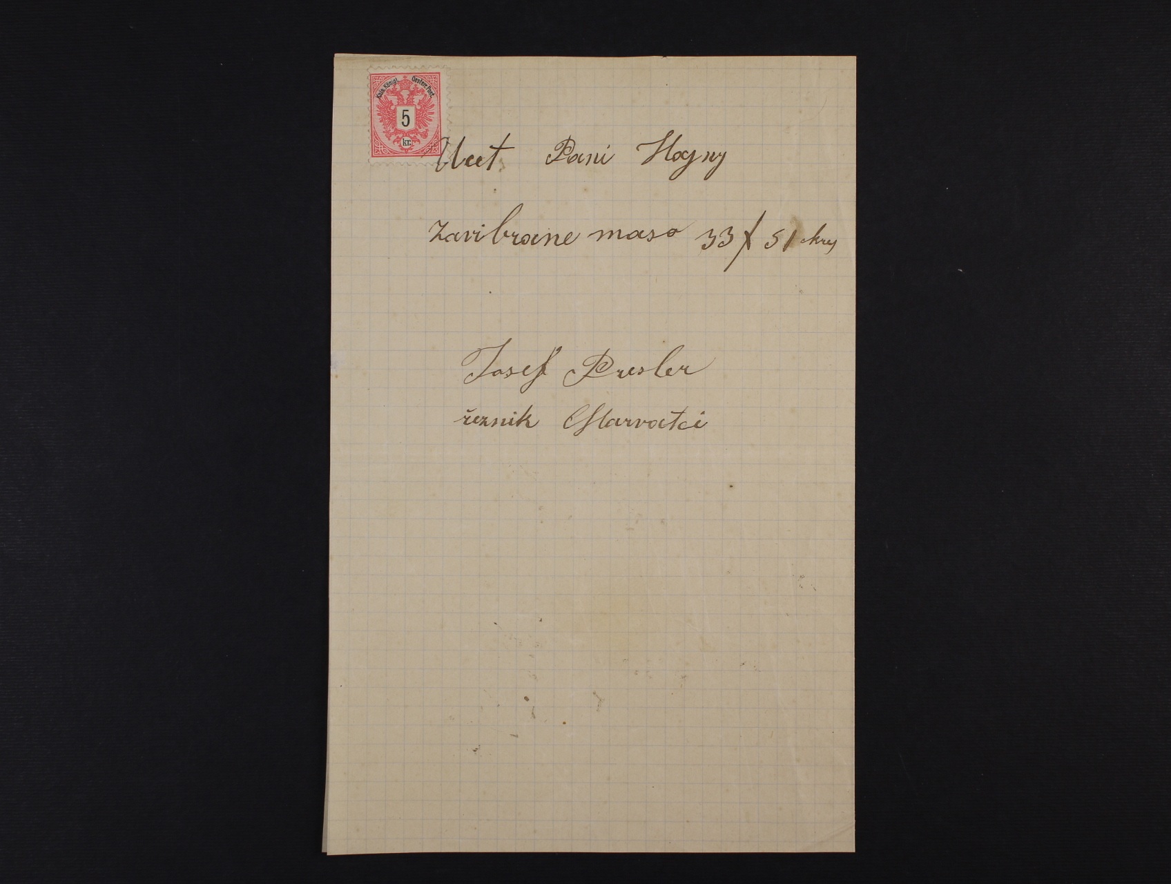účet na 33F,50kr s vylepenou zn. Mi. č. 46 namísto kolku (fiskální použití), zajímavé