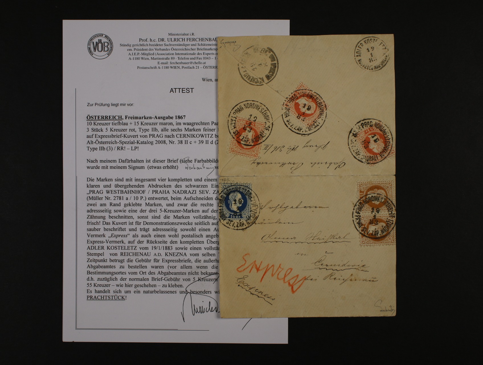 dopis, 3- barevná frankatura Expres mimo doručovací obvod, tedy BOTENLOHN 55kr se známkami 5+5+5+10+15+15kr, atest Ferch. „Prachtstuck“ RR-LP,