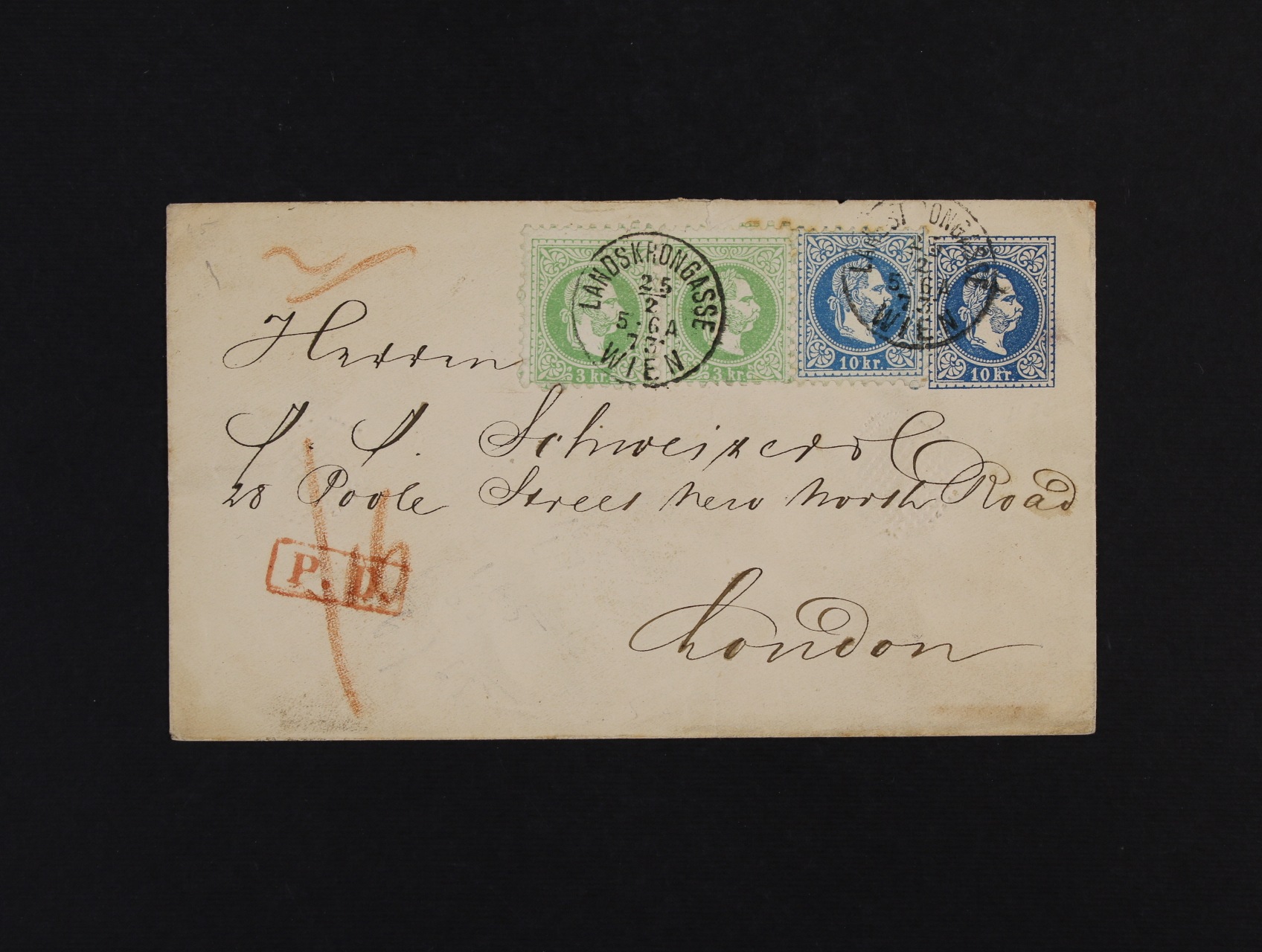 obálka frank. VI. emisí 1867 10Kr + 10+3+3Kr z Vídně do Londýna, vzácný modrý „gleichfarbig“ dofrank, kat. 2000 EUR