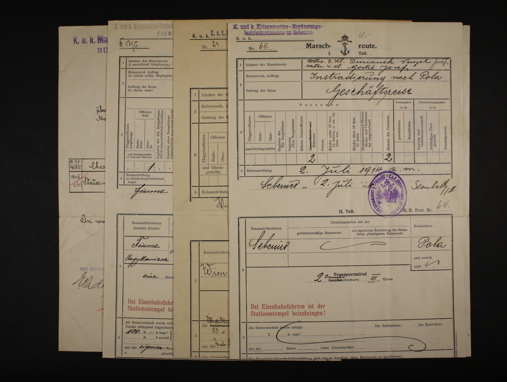 1809 Cestovní příkaz pro doplňování jednotek rak. námořnictva - sestava 4 ks formulářů z Budapešti, Fiume, Šibeniku a Vídně, zajímavé dobové doklady 500