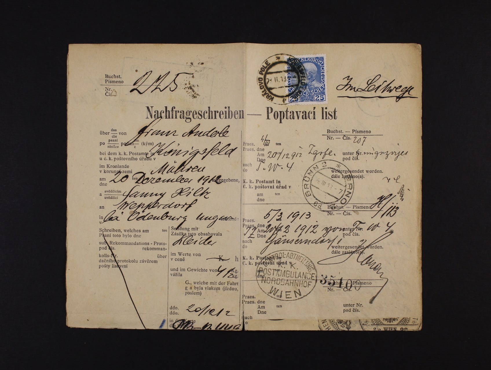 1810 List poptávací frank. zn. 25h F.J. 1908 s DR KRÁLOVO POLE 28.2.13 + další průch. a přích. raz., na zadní str. zálepka v místech natržení K.K.POST u. TELEGRAPHENAMT WIEN 28, zajímavé 400