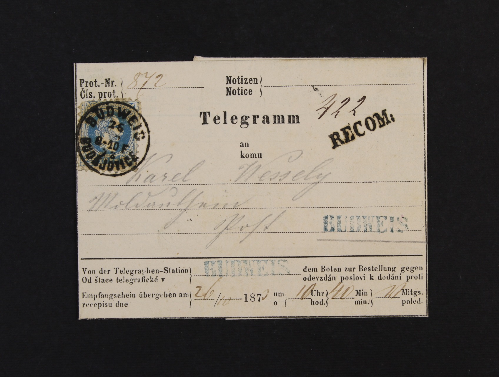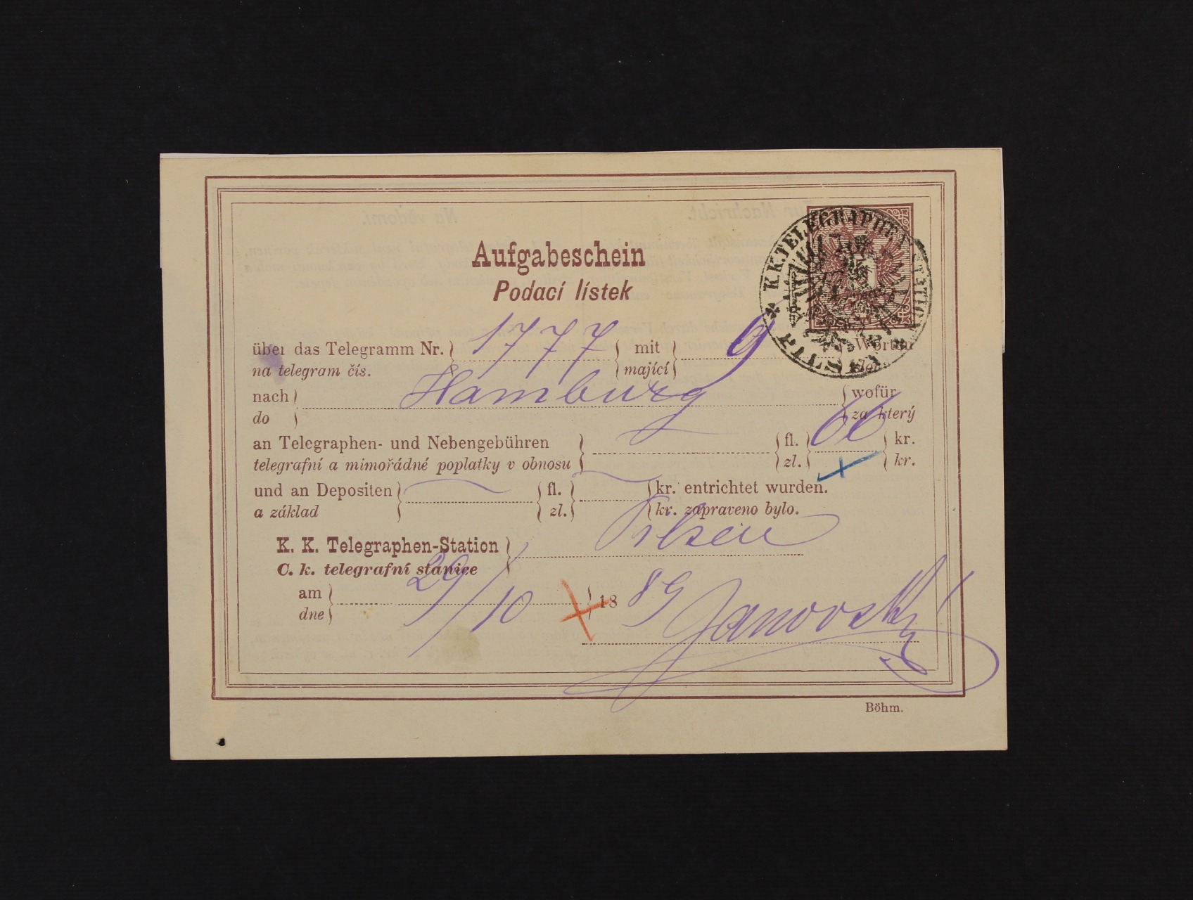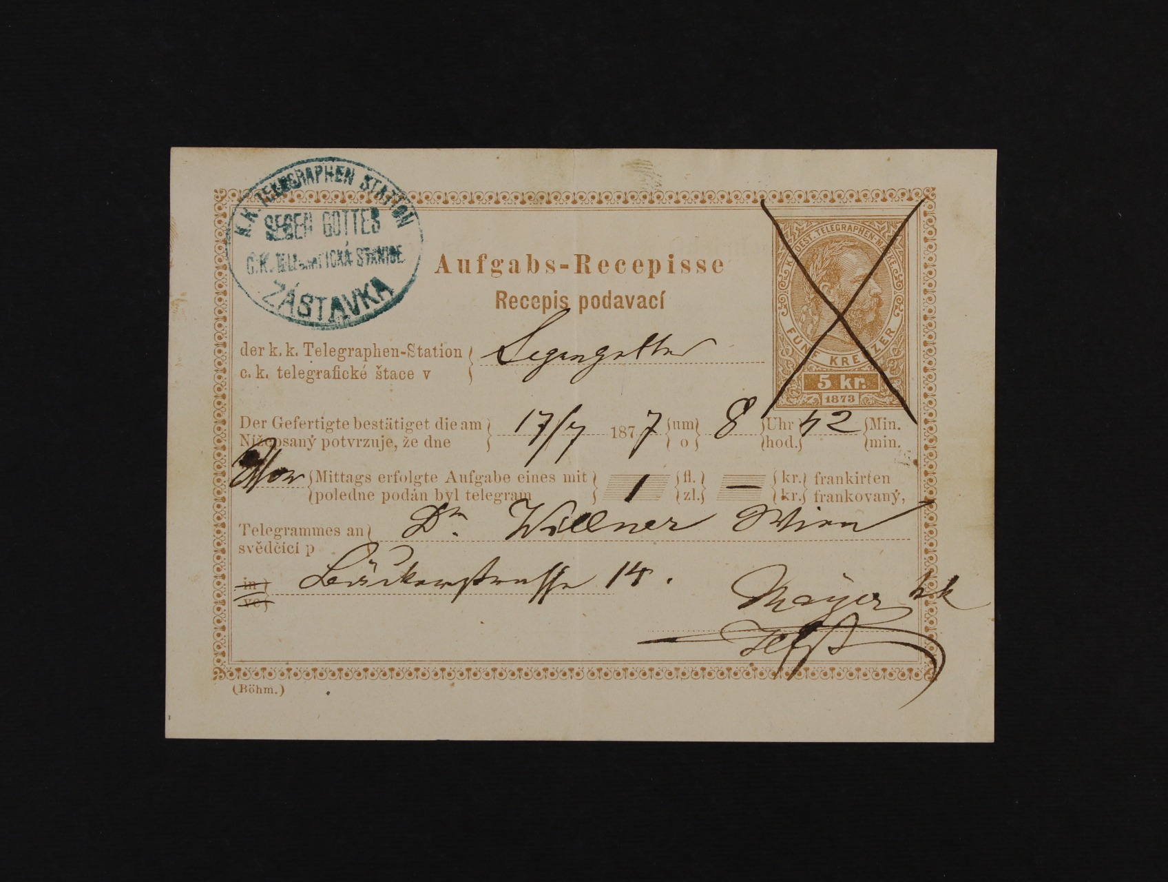 1814 podací recepis 5kr z r. 1873 do Vídně znehodnocený škrtem pera s datací v textu 17.7.1877 + oválné modré dvojjazyčné služ. raz. C.K. TELEGRAFICKÁ STANICE ZASTÁVKA, velmi zajímavé 400