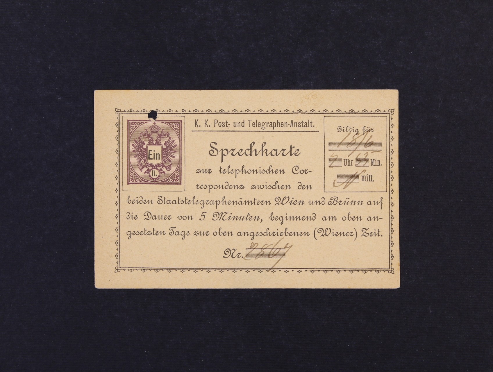 1817 Telefonní karta Mi. č. TK 2 na telefonní hovor z Vídně do Brna na dobu 5 min., pod. evidenční číslo 2867 dne 18.6.1887, znehodnoc. průpichem, zajímavé 300