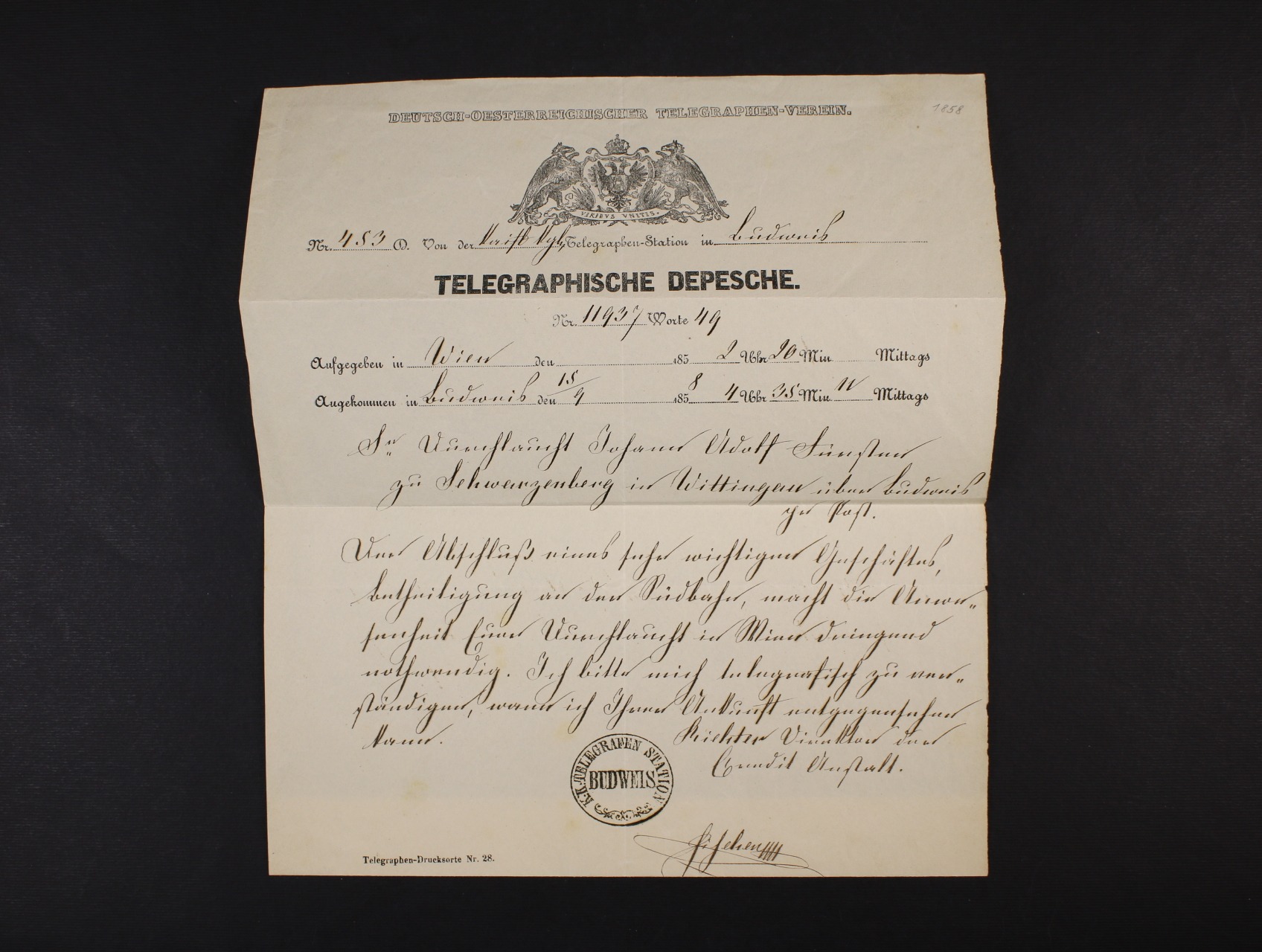 1818 TELEGRAFISCHE DEPESCHE z 15.9.1858, adresováno na Schwarzenberg ve Wittingen, odesílací oválné raz. K.K. TELEGRAFEN STATION BUDWEIS, zajímavé 400