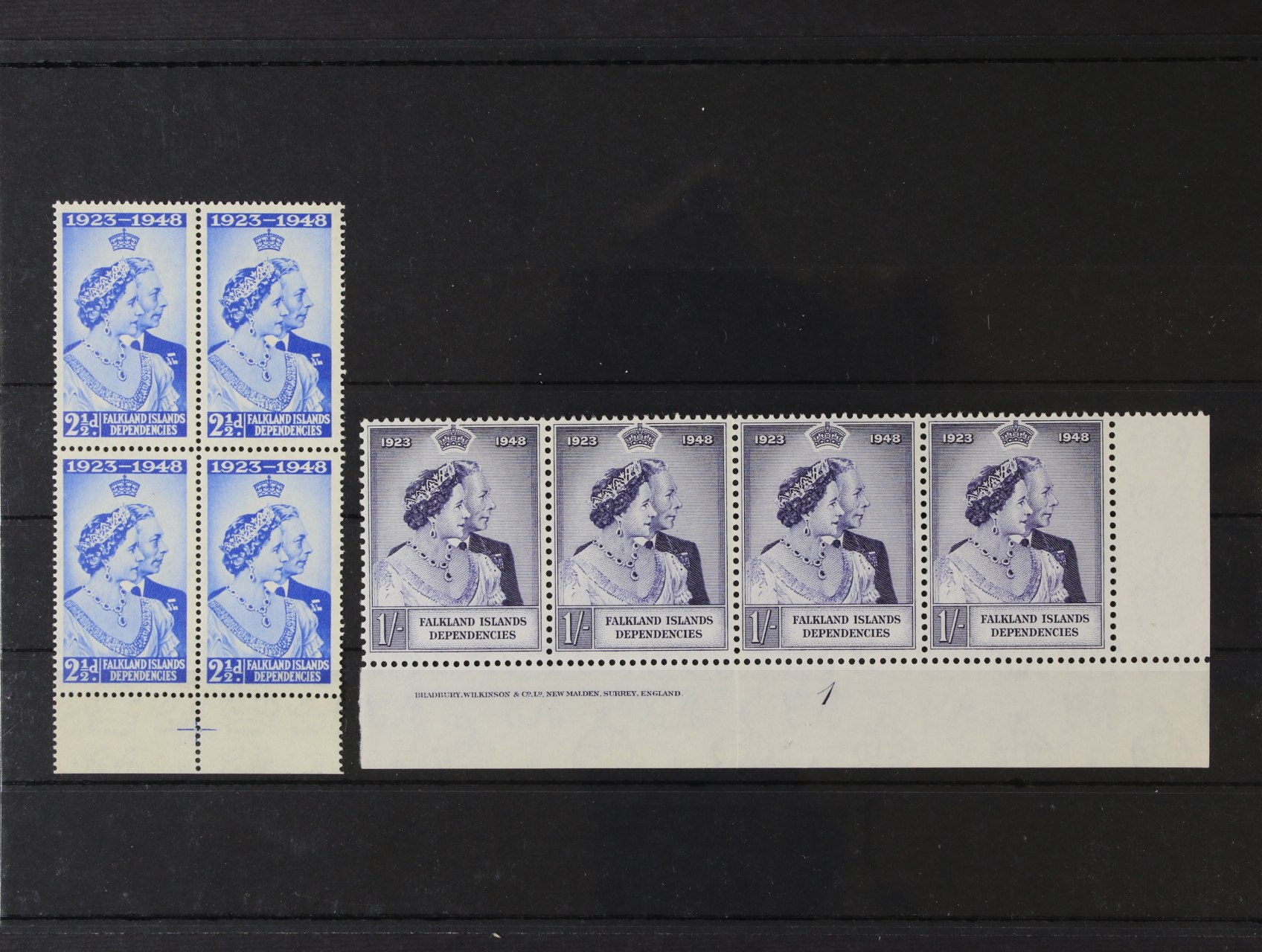 1870 Falkland Islends Dependencies - zn. Mi. č. 96 ve čtyřbloku se spodním okrajem, zn. Mi. 97 - pravá spodní roh. čtyřpáska s označením tiskárny a DZ 1, cca 600 EUR 5000