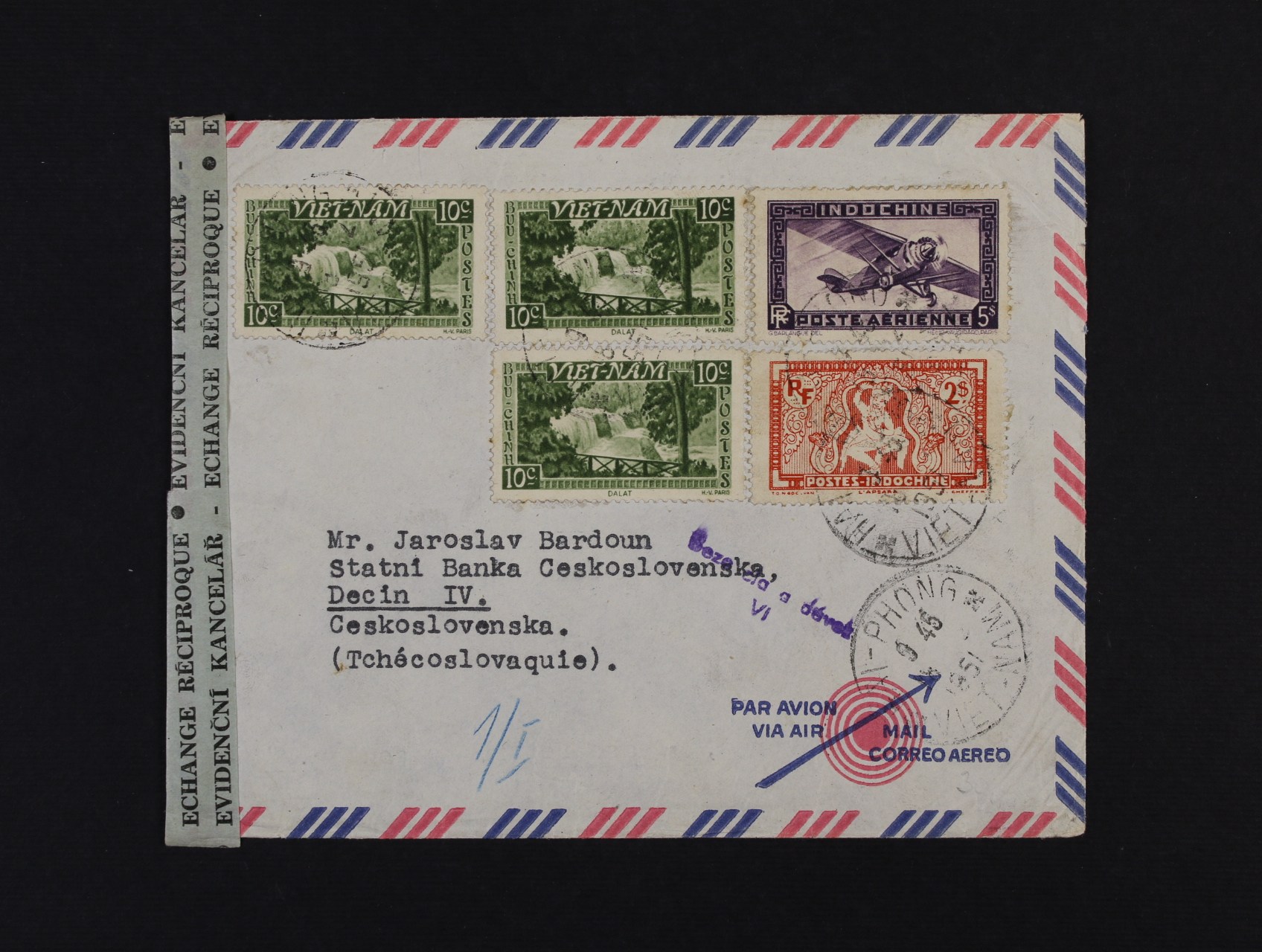 1874 Indočína - let. dopis do ČSR frank. smíš. frankaturou zn. Vietnam + Indočína, pod. raz. HAI-PHONG 9.8.1951 700