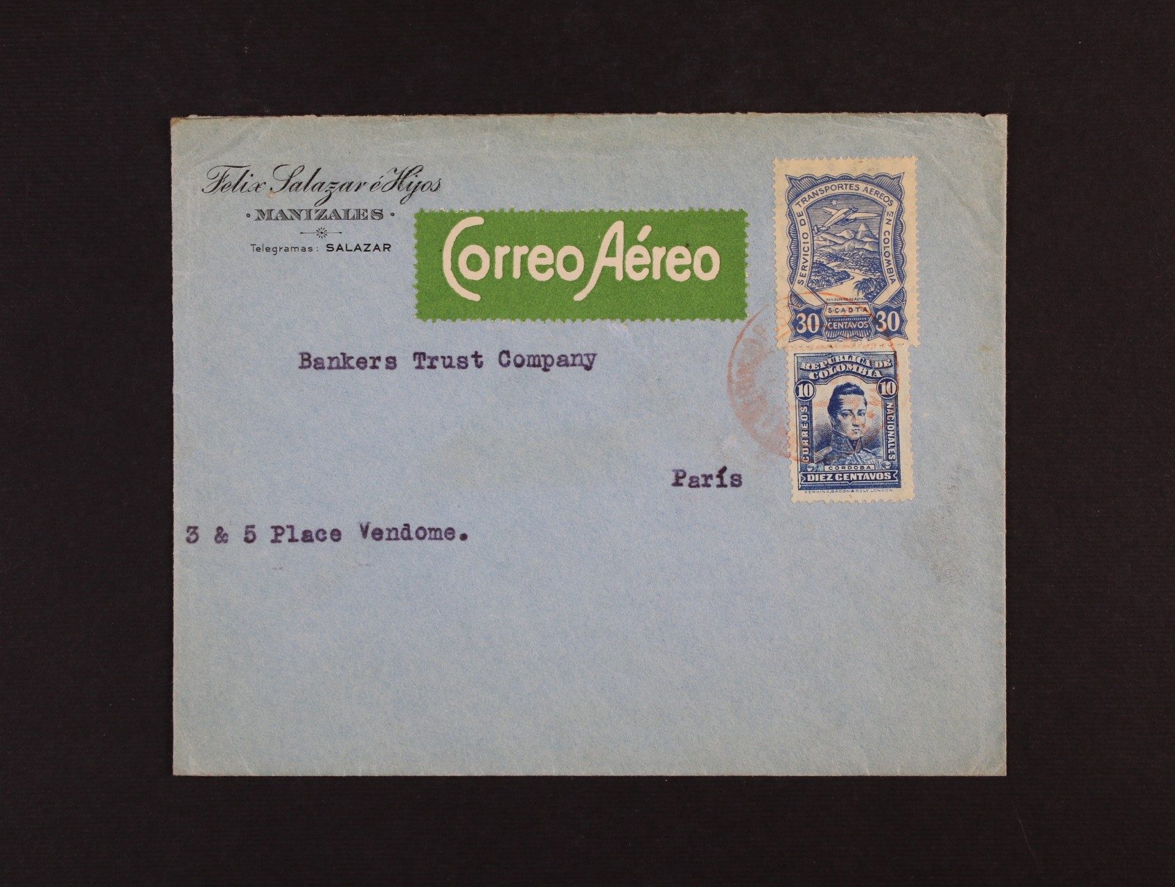 Kolumbie - let. dopis do Paříže frank. výplatní zn. 10c + let. zn. S.C.A.D.T.A. 30c, nečitelné červené pod. raz.