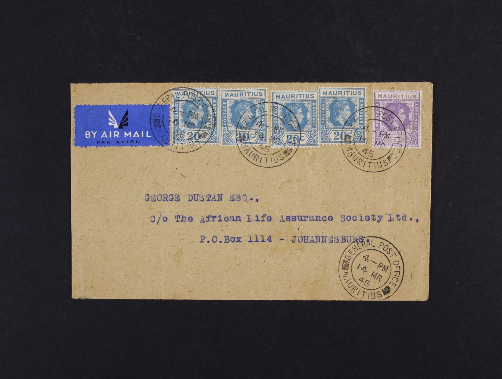 Mauritius - let. dopis do Johanesburgu frank. zn. s portrétem Jiřího VI. pod. raz. GENERAL POST OFICE MAURITIUS 14.MR.45