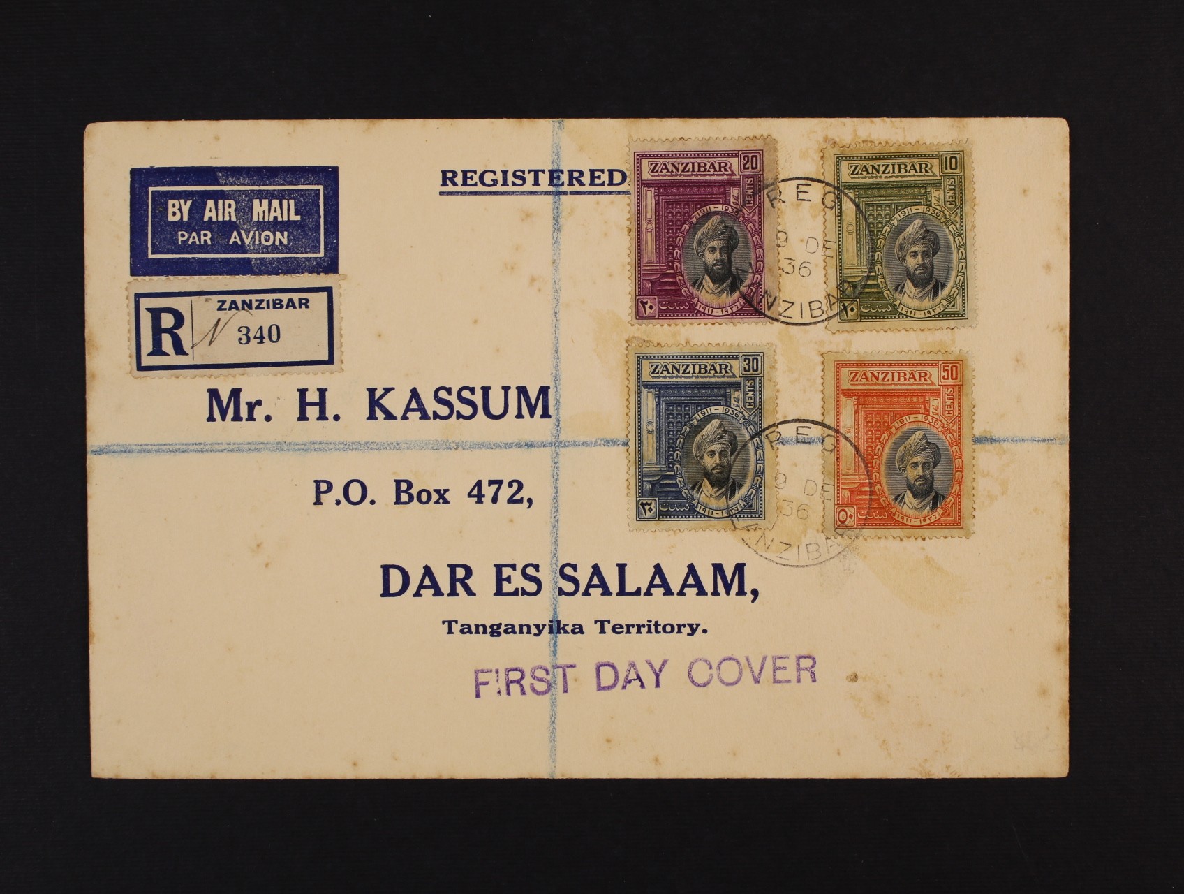 Zanzibar - let. R-celistvost do Tanganiky frank. zn. 10c, 20c, 30c a 50c, pod. raz. REG. 9.DE.36 ZANZIBAR, přích. raz. DARESSALAAM 9.DE.36
