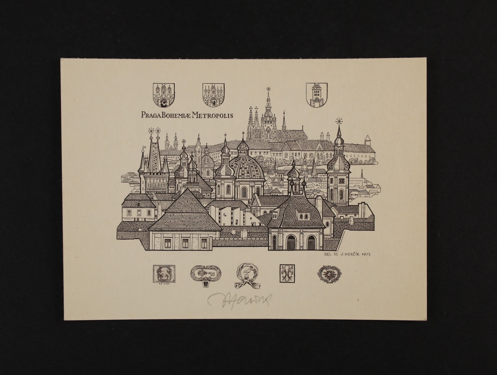 Drobná grafika - Herčík Josef - signovaná ocelorytina PRAGA BOHEMIAE METROPOLIS o rozm. 15 x 10,5 cm