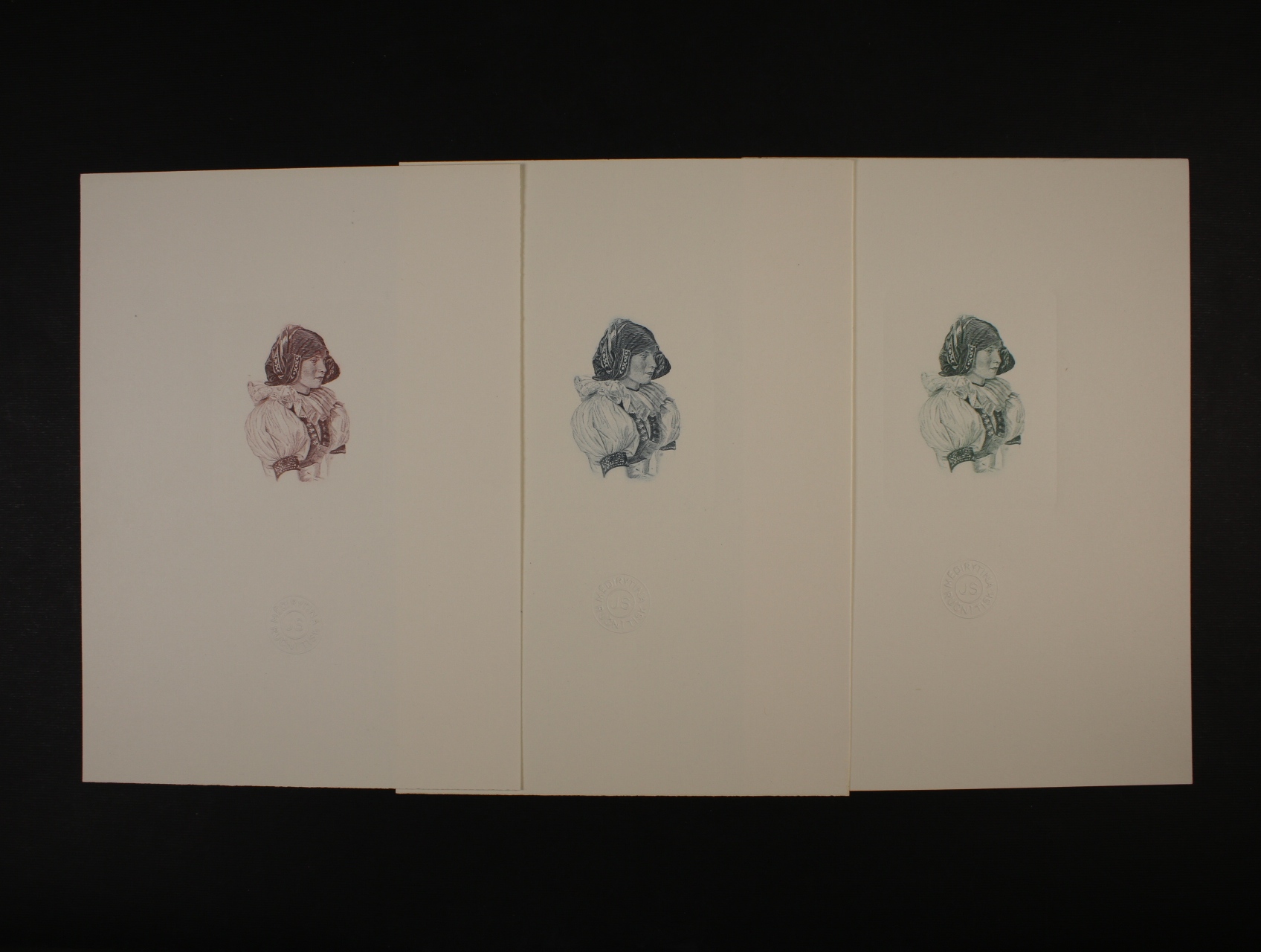 Drobná grafika - Schmidt Jindra - sestava 3 ocelorytin Hanačka v barvě fialové, světlezelené a tmavězelené, rozm. 15 x 20,5 cm s reliéfní pečetí MĚDIRYTINA RUČNÍ TISK J.S.