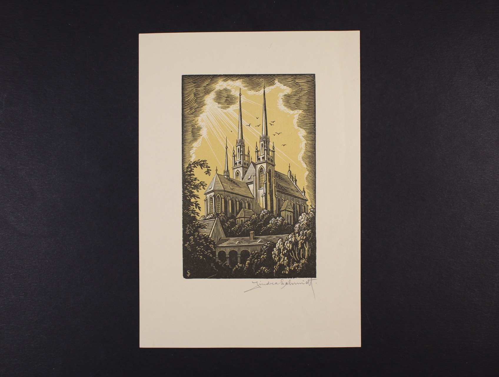 Drobná grafika - Schmidt Jindra - signovaný dvoubar. dřevoryt Kostel o rozm. 15 x 21 cm