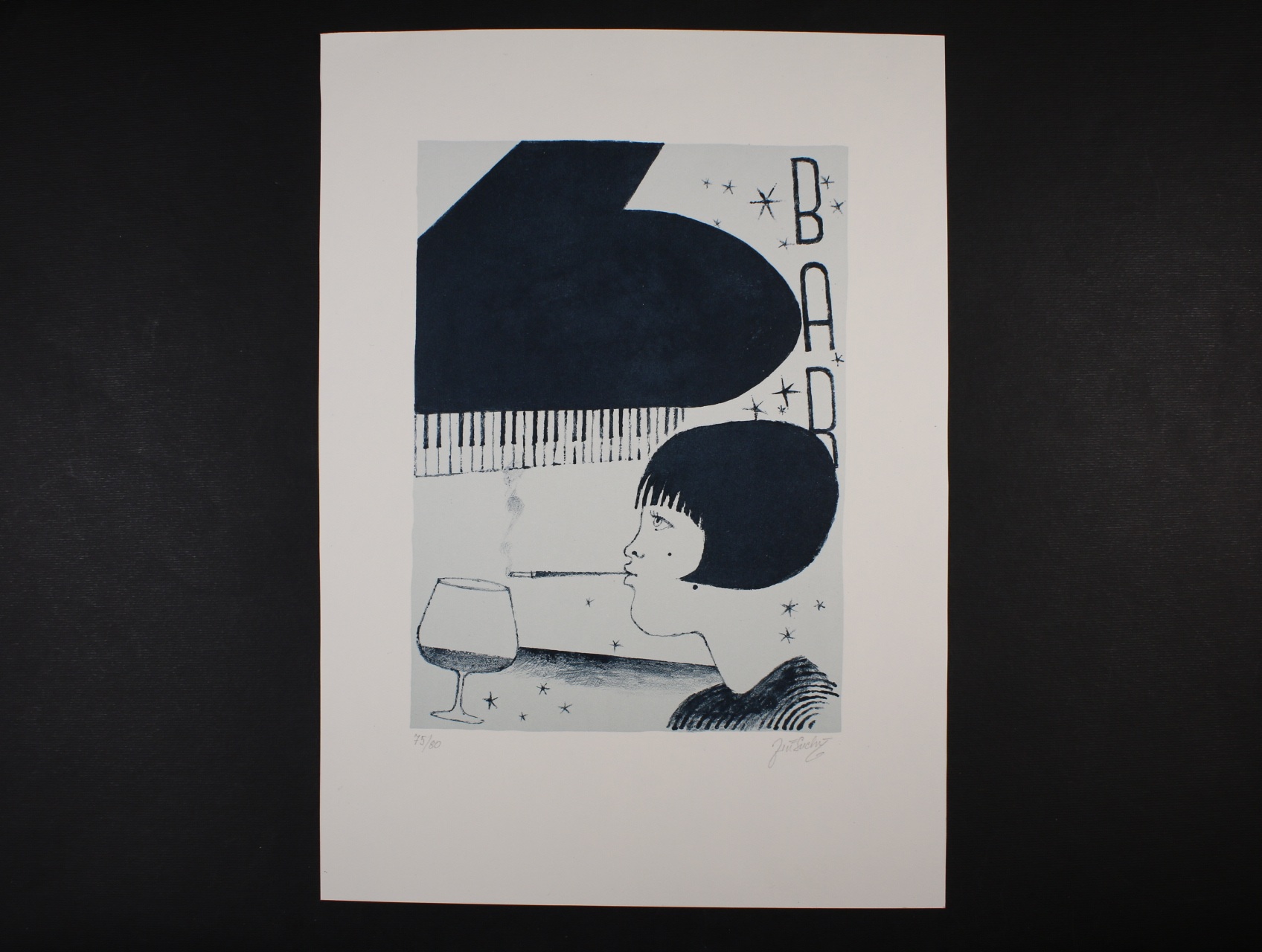 Drobná grafika - Suchý Jiří, 1931 - význačný žijící čs. skladatel, spisovatel, herec, režisér divadla SEMAFOR - jednobar. litograf. koláž formátu A4 (autorský tisk 75/85) s vlastnoručním podpisem