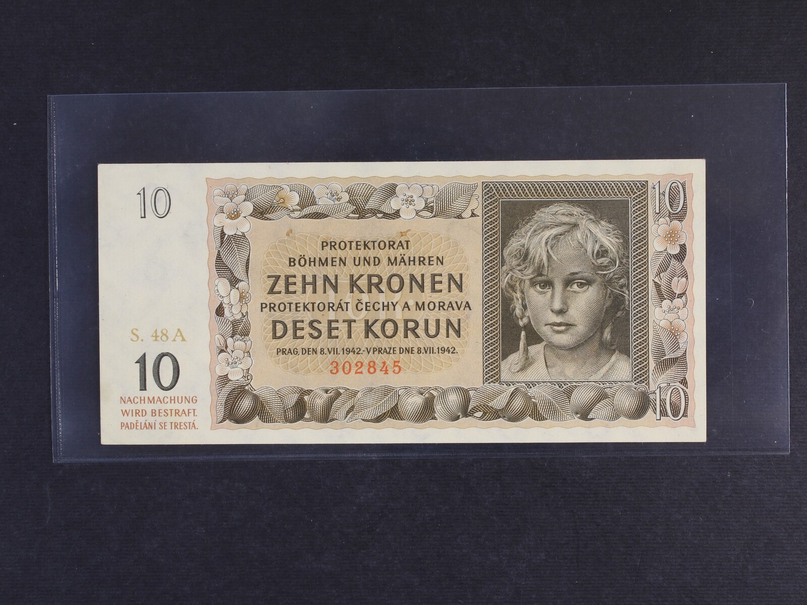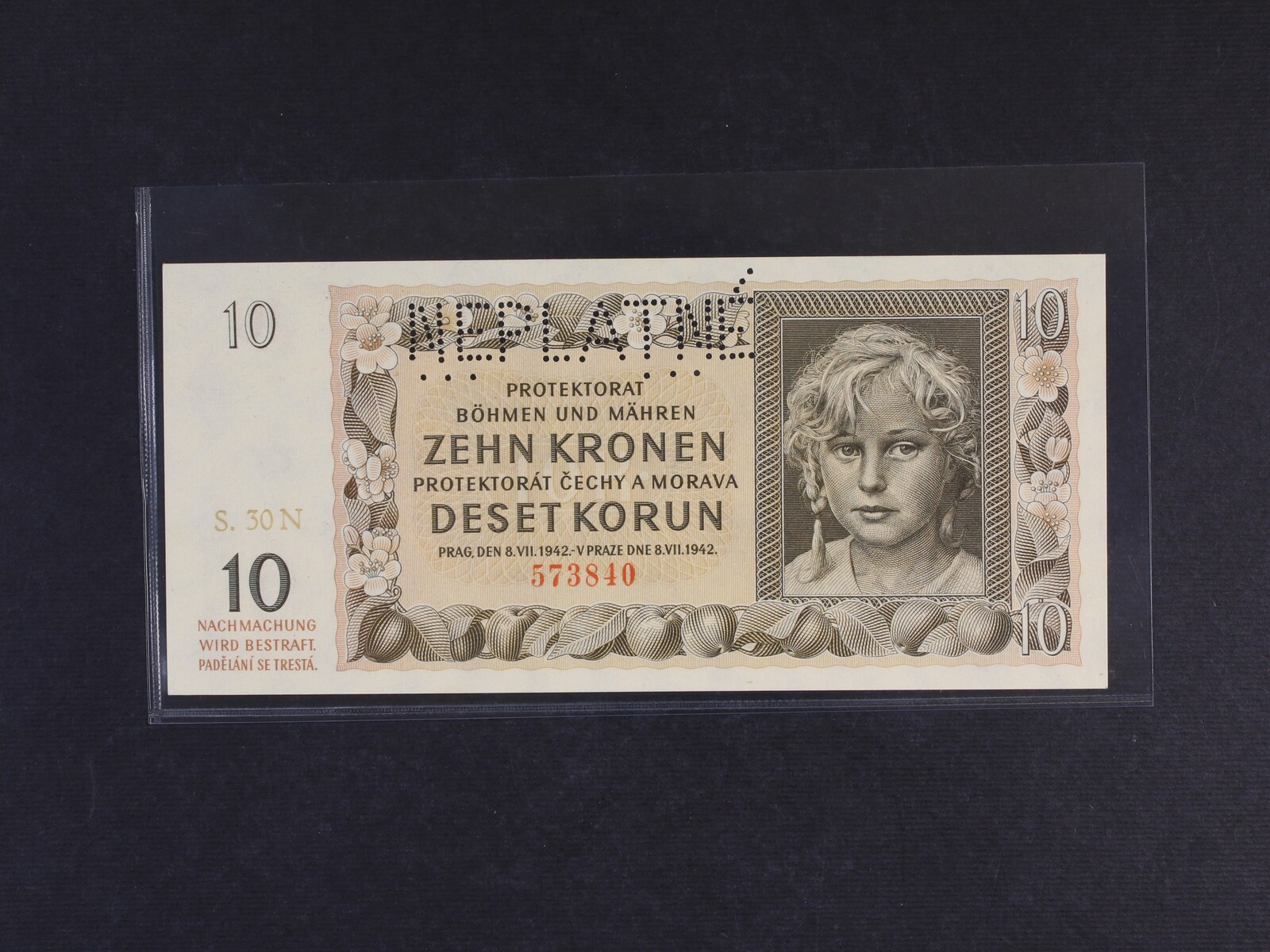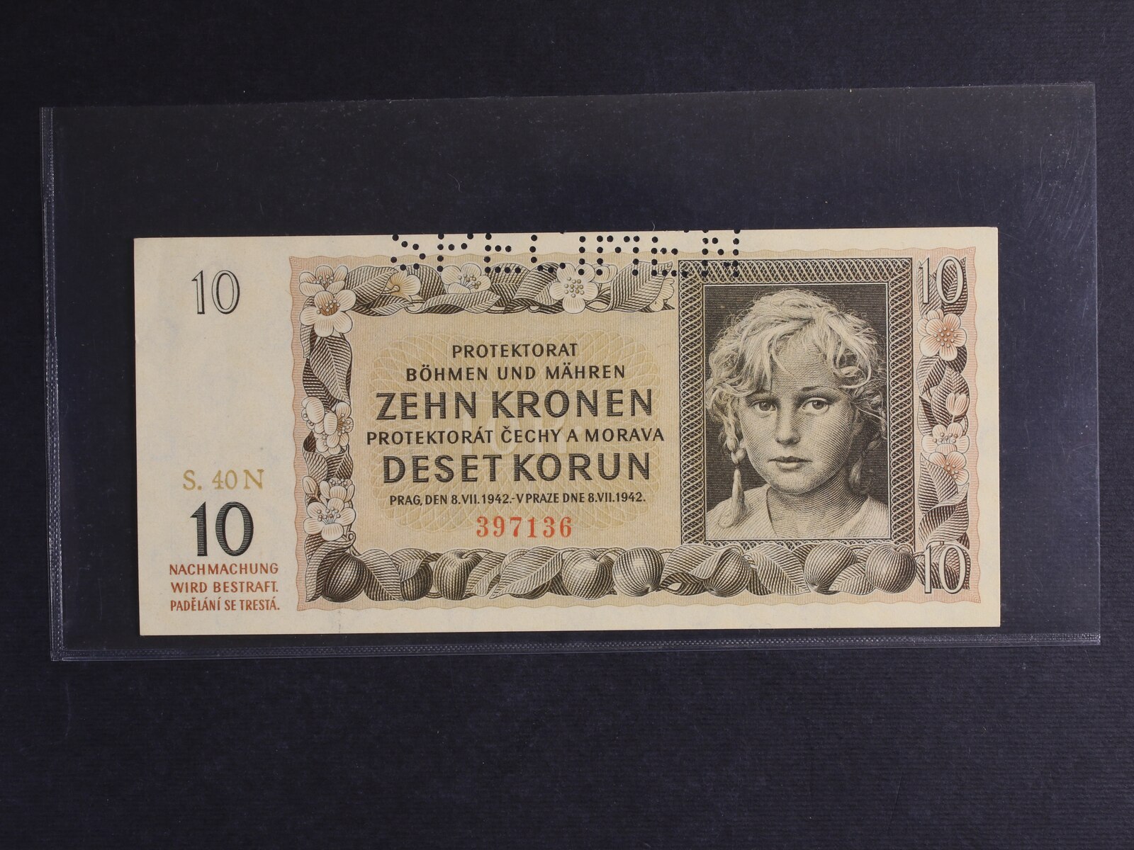 10 K 8.7.1942 série 40 N s perf. SPECIMEN posunutým nahoru až mimo bankovku, Ba. 37b, Pi. 8s