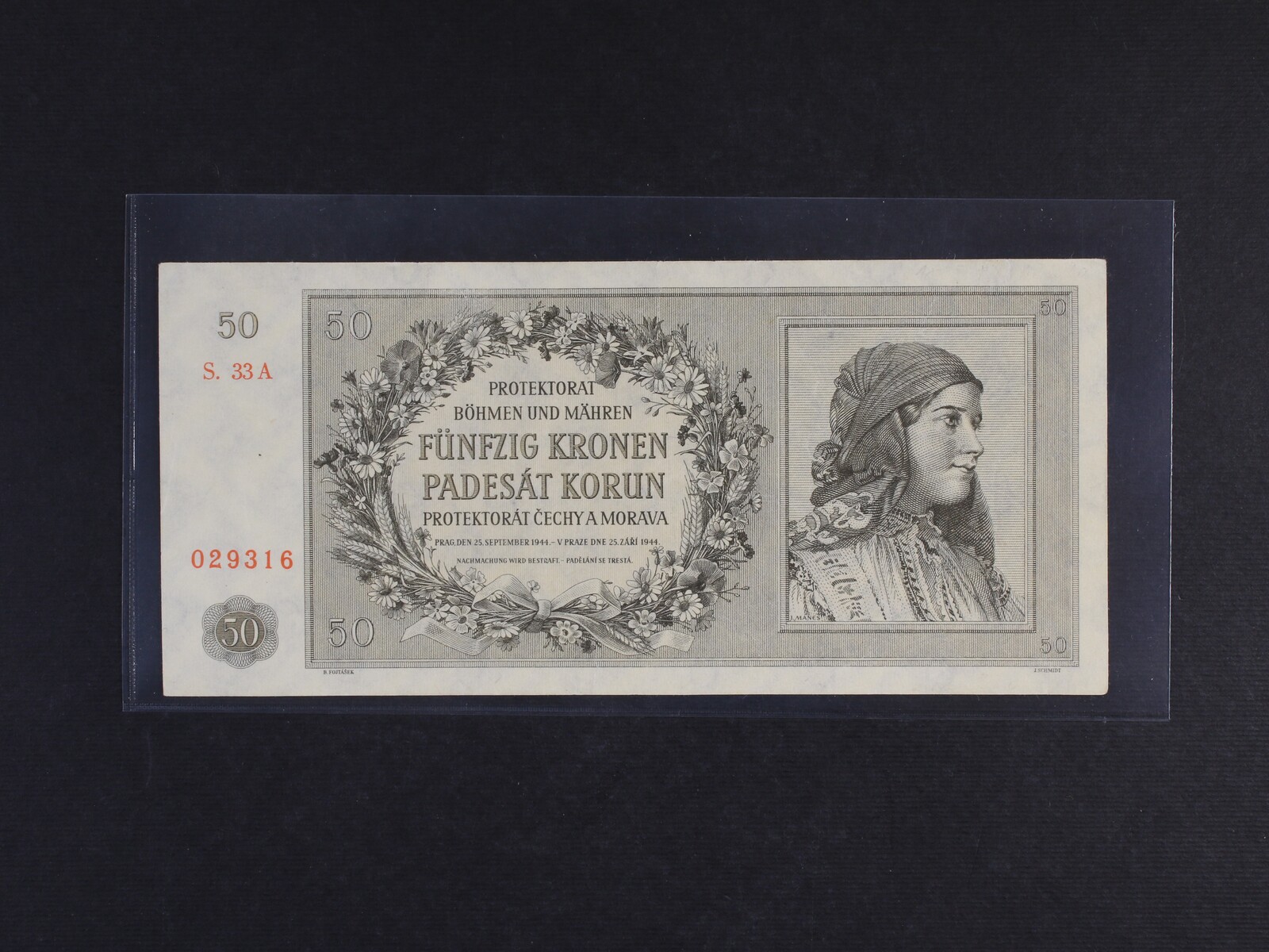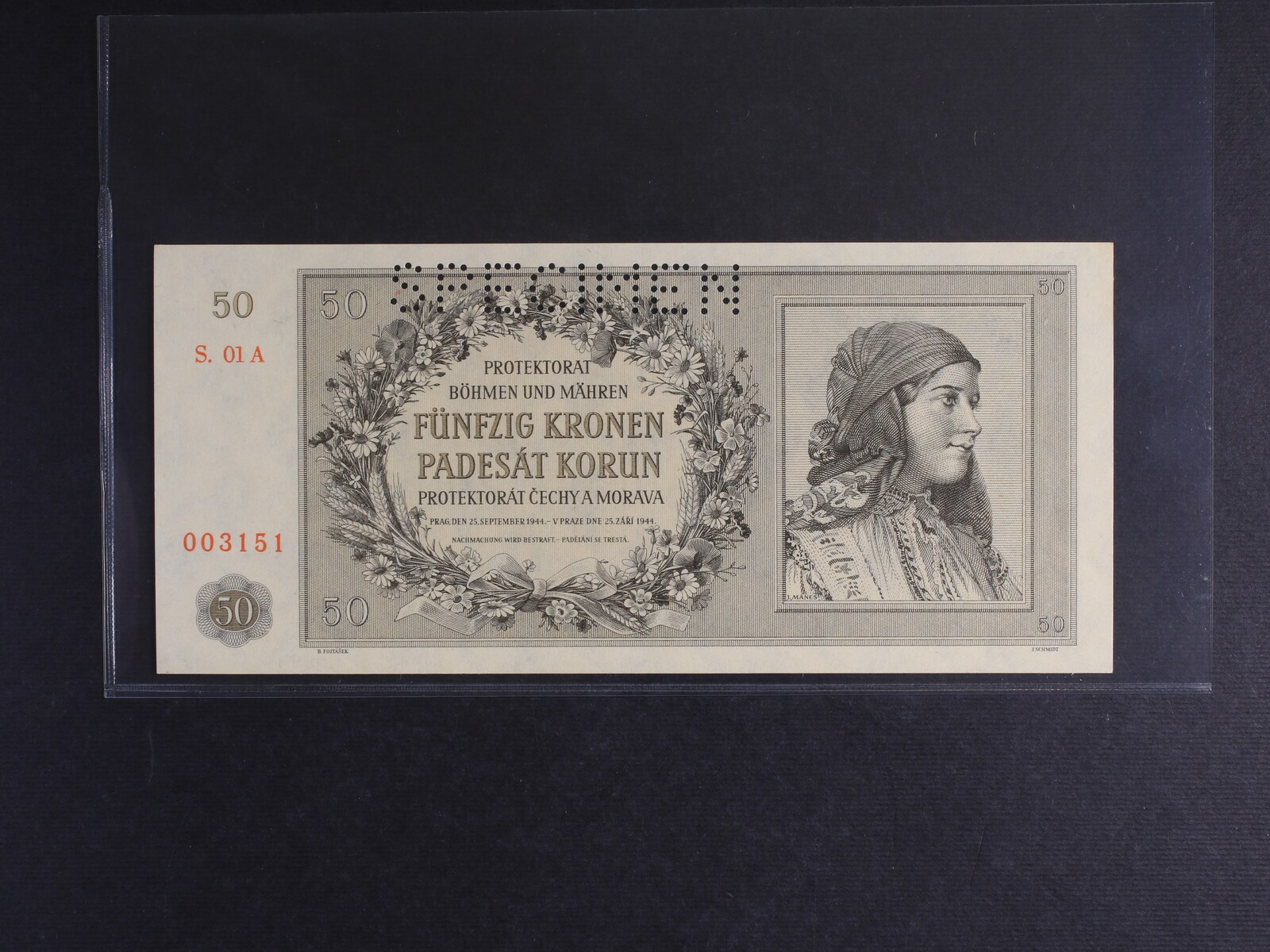50 K 25.1.1944 série 01 A s perf. SPECIMEN, Ba. 42, Pi. 10s, první série