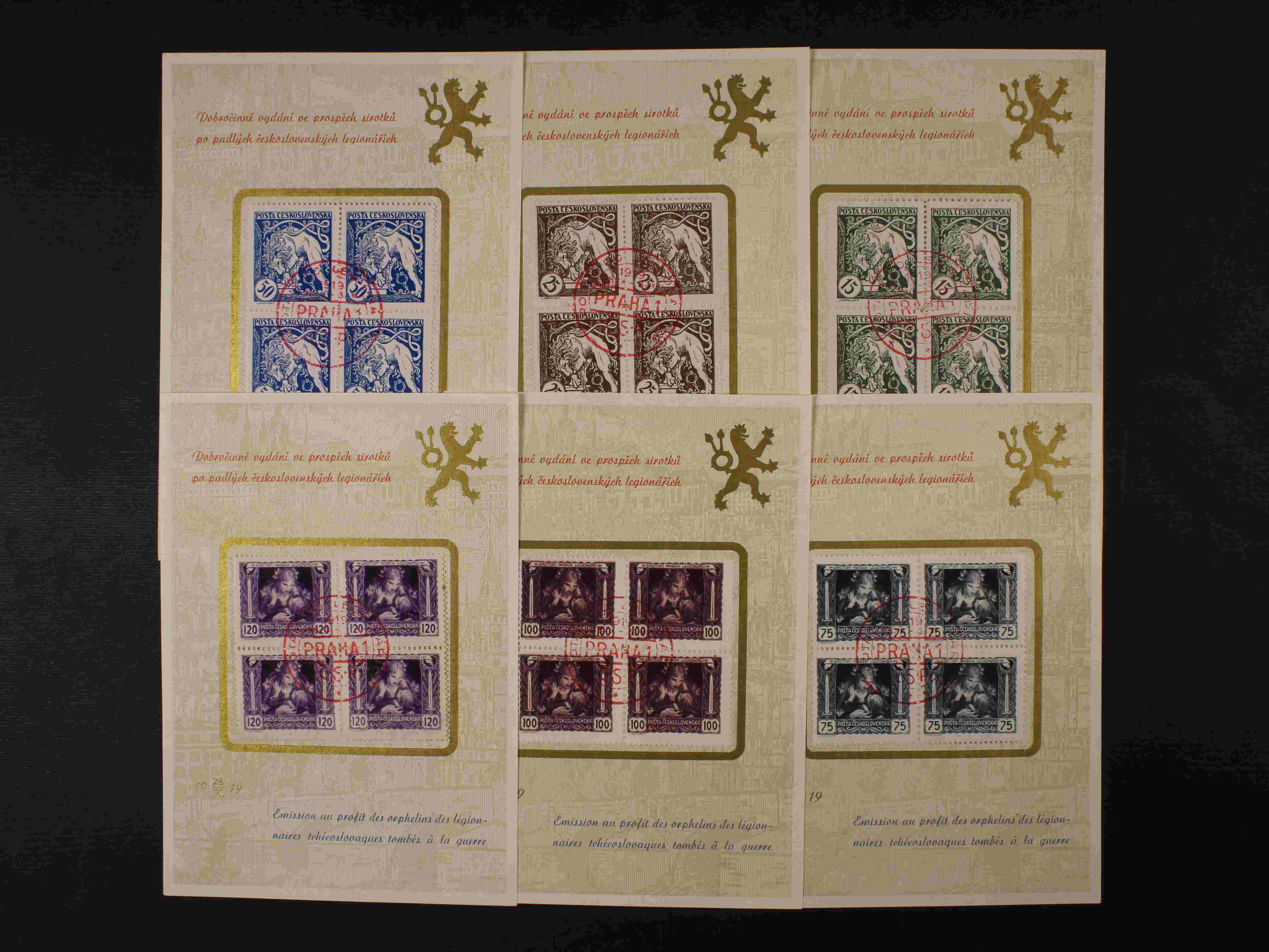 229 zn. č. 27 - 32 ve čtyřblocích s červeným nátiskem - sestava 6ti pam. listů ve prospěch sirotků po padlých čs. legionářích 500