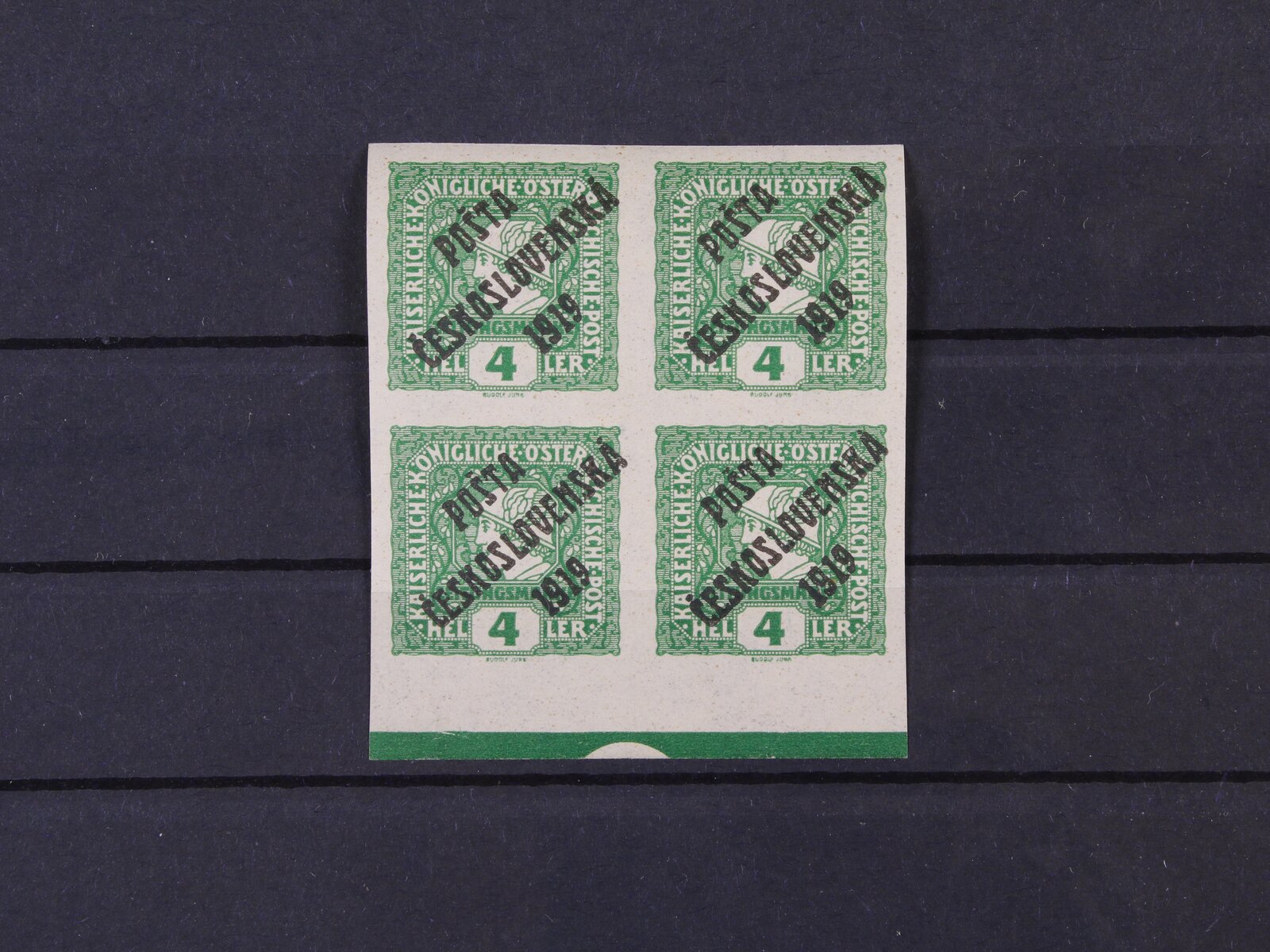 283 zn. č. 57 A s nepřetištěným kuponem, zn. 57 A s výrazným stroj. obtiskem přetisku, zn. 58 B ve čtyřbloku ST I + III 460