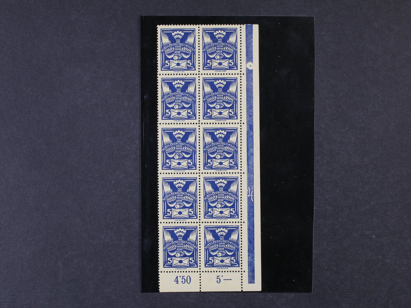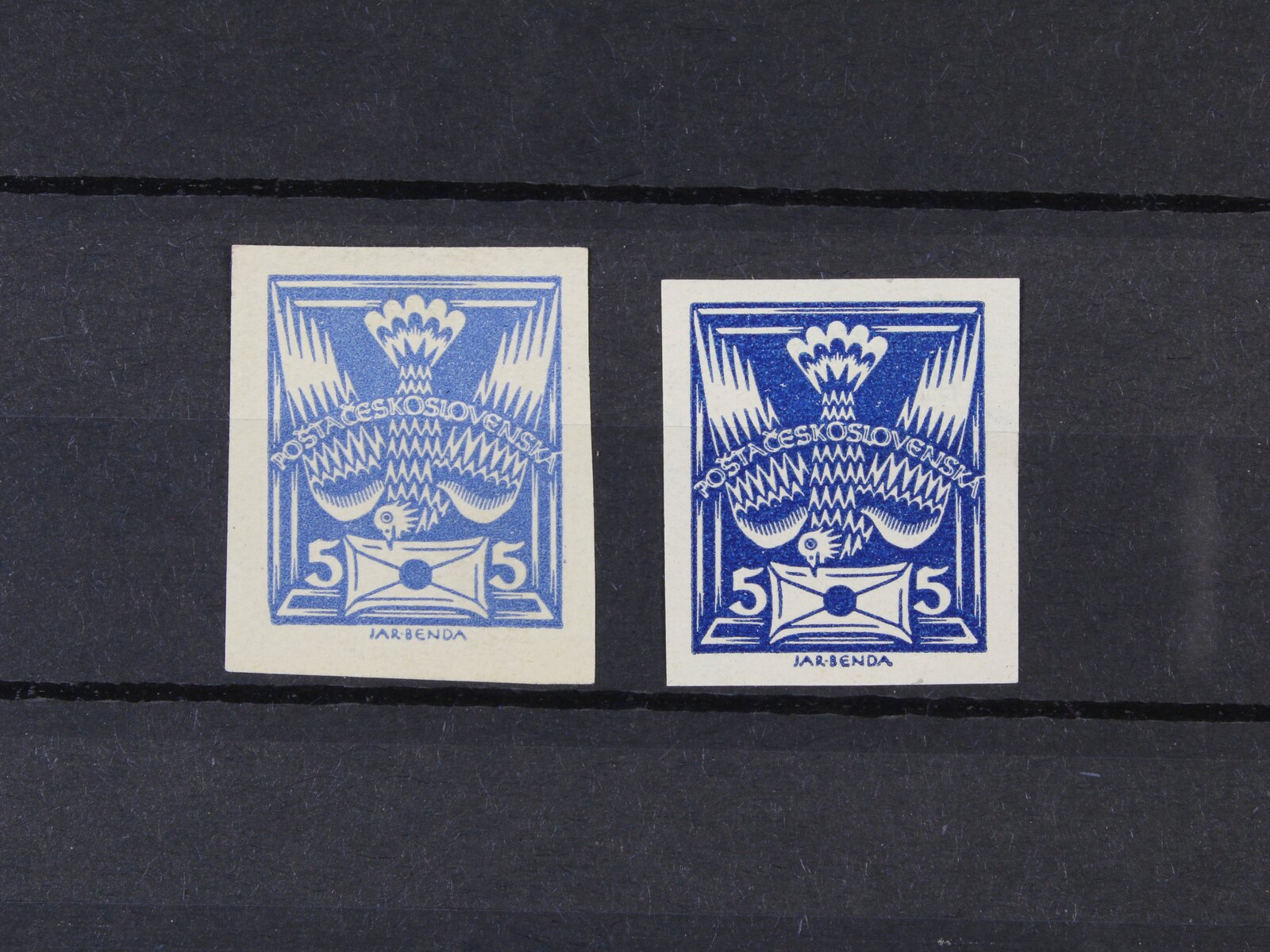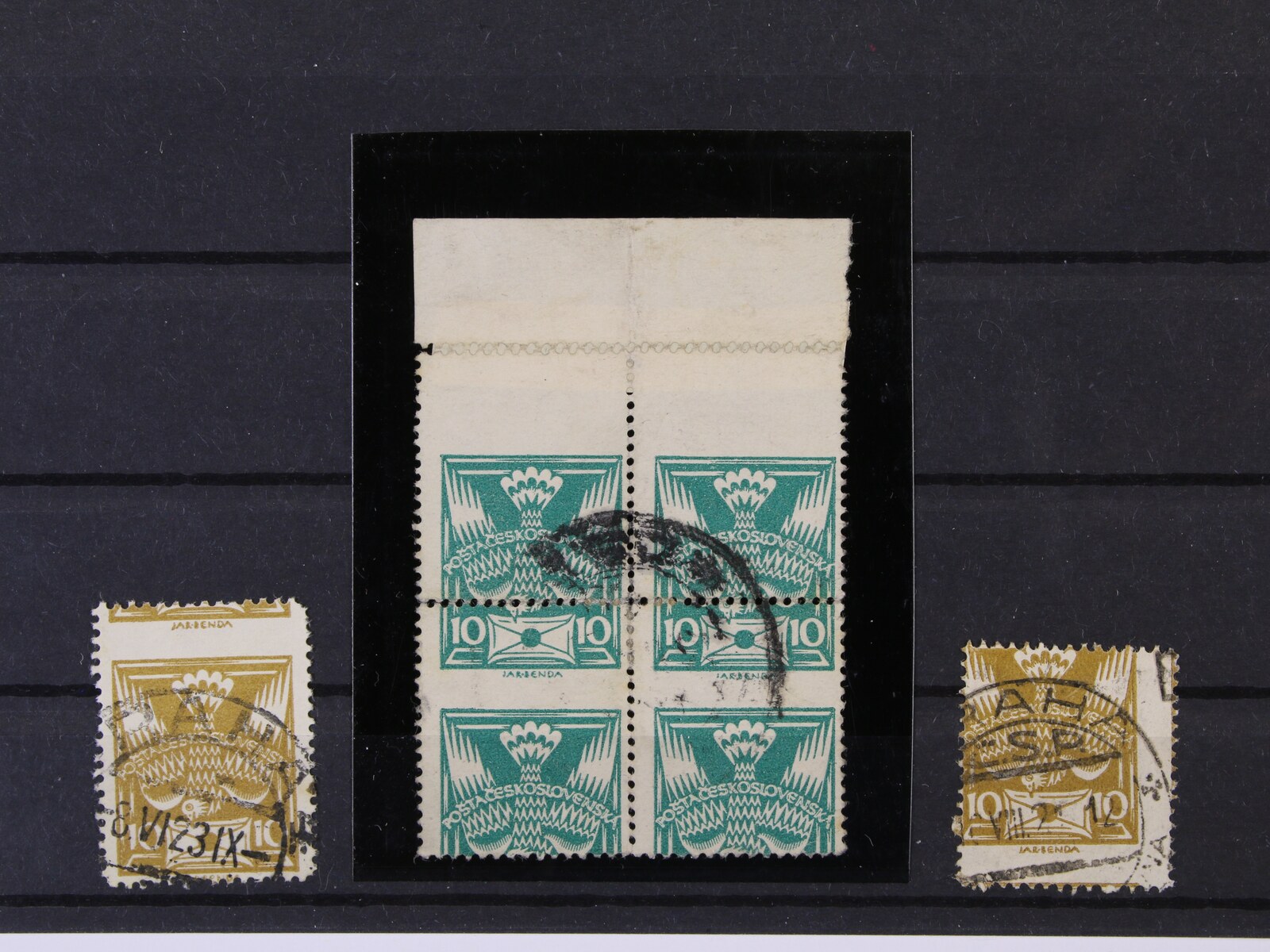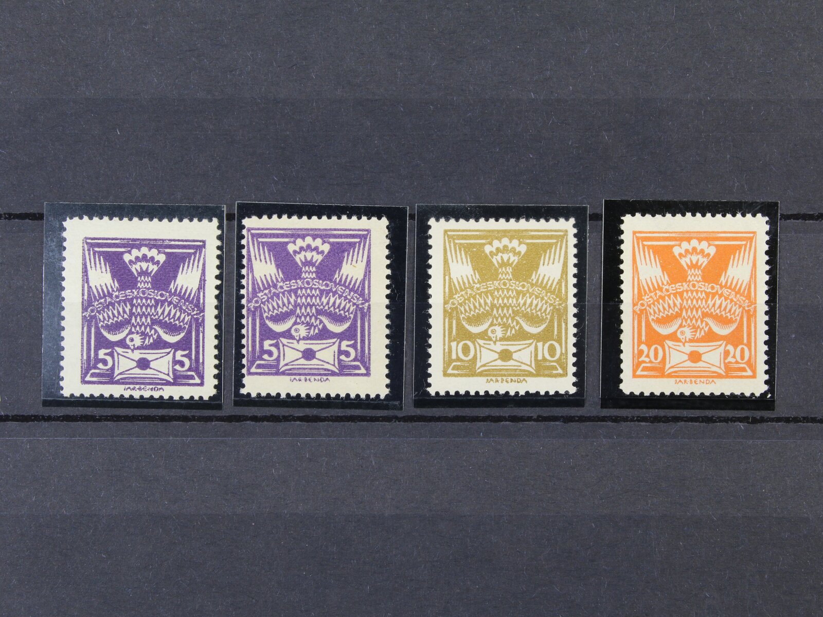 379 zn. č. 145 ve čtyřbloku s horním okrajem a silným posunem perforace nahoru, v perforaci natržena a podlepená, zn. č. 146 (2x) s posuny perforace 200