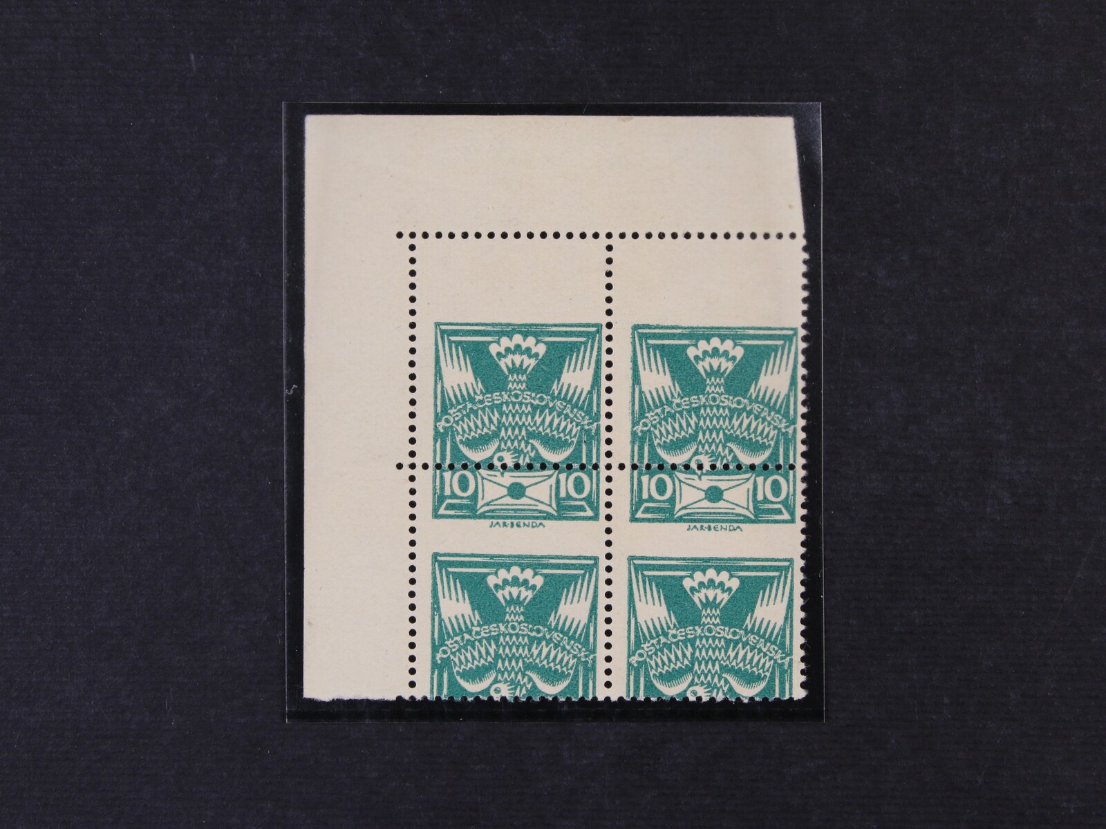 378 zn. č. 145 A - levý horní roh. čtyřblok s výrazným posunem perforace nahoru, zajímavé 800