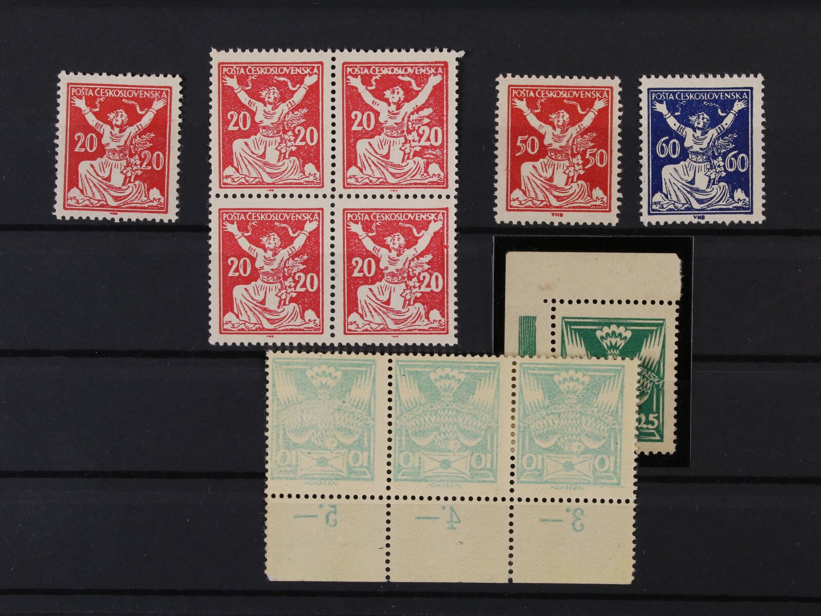 380 zn. č. 145 ve vodorovné třípásce se spodním okrajem a stroj. obtiskem, zn. č. 149, typ II - levý horní roh. kus, zn. 151 - jedna zn. + čtyřblok, zn. č. 151, 155 600