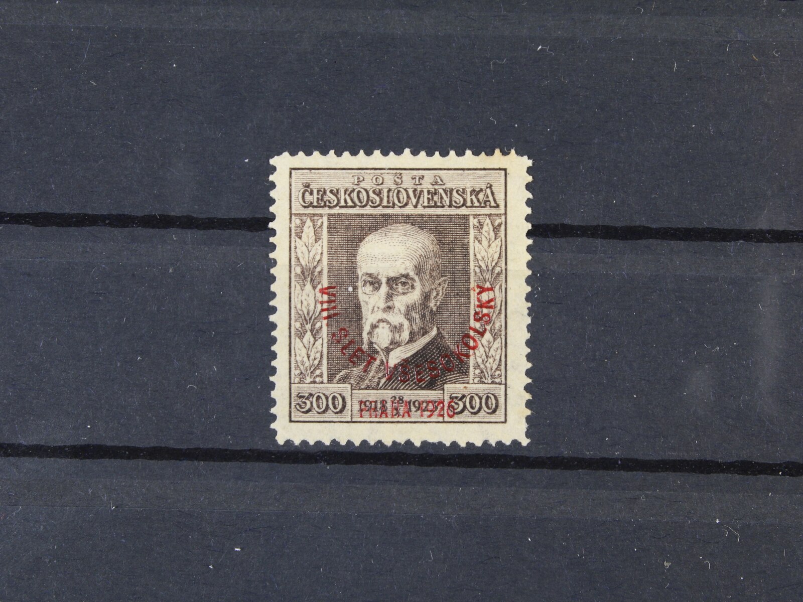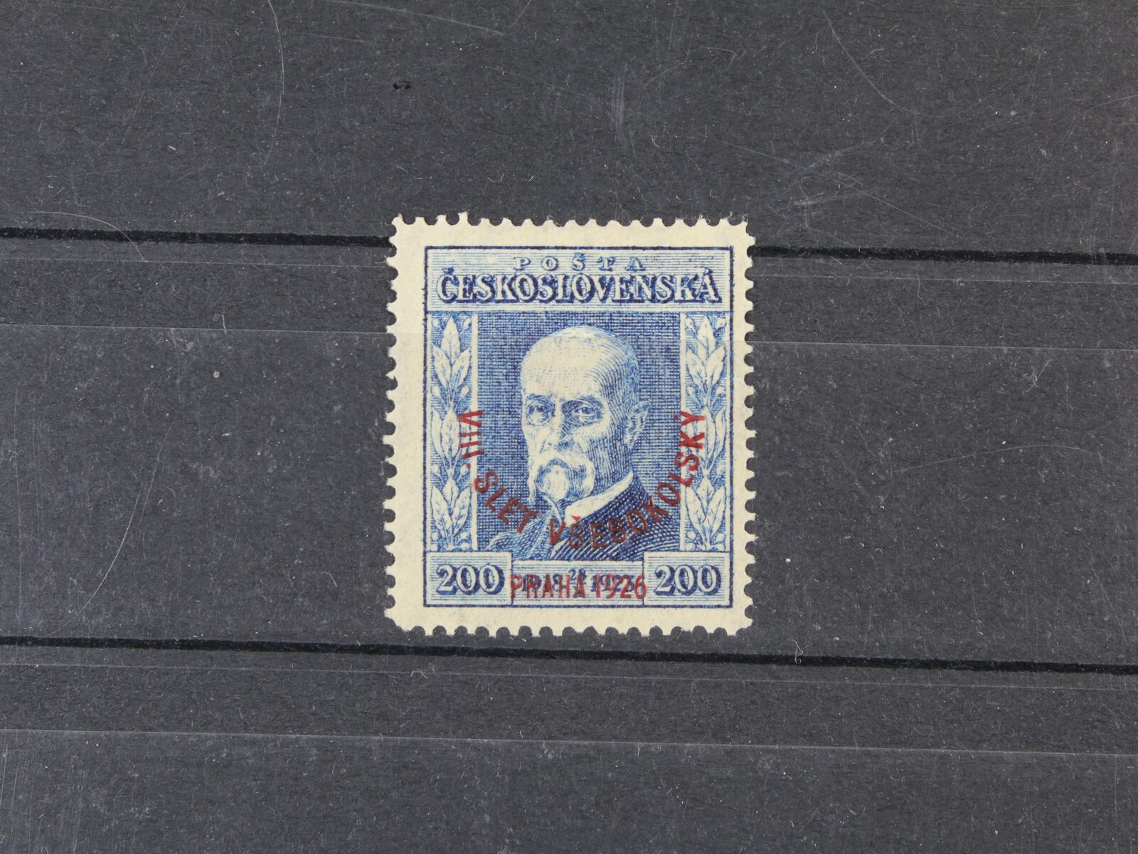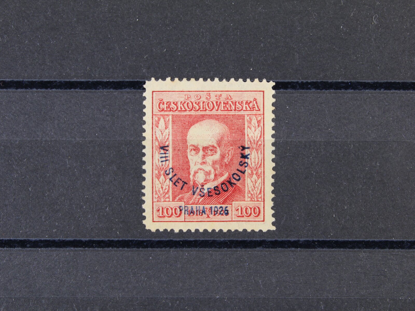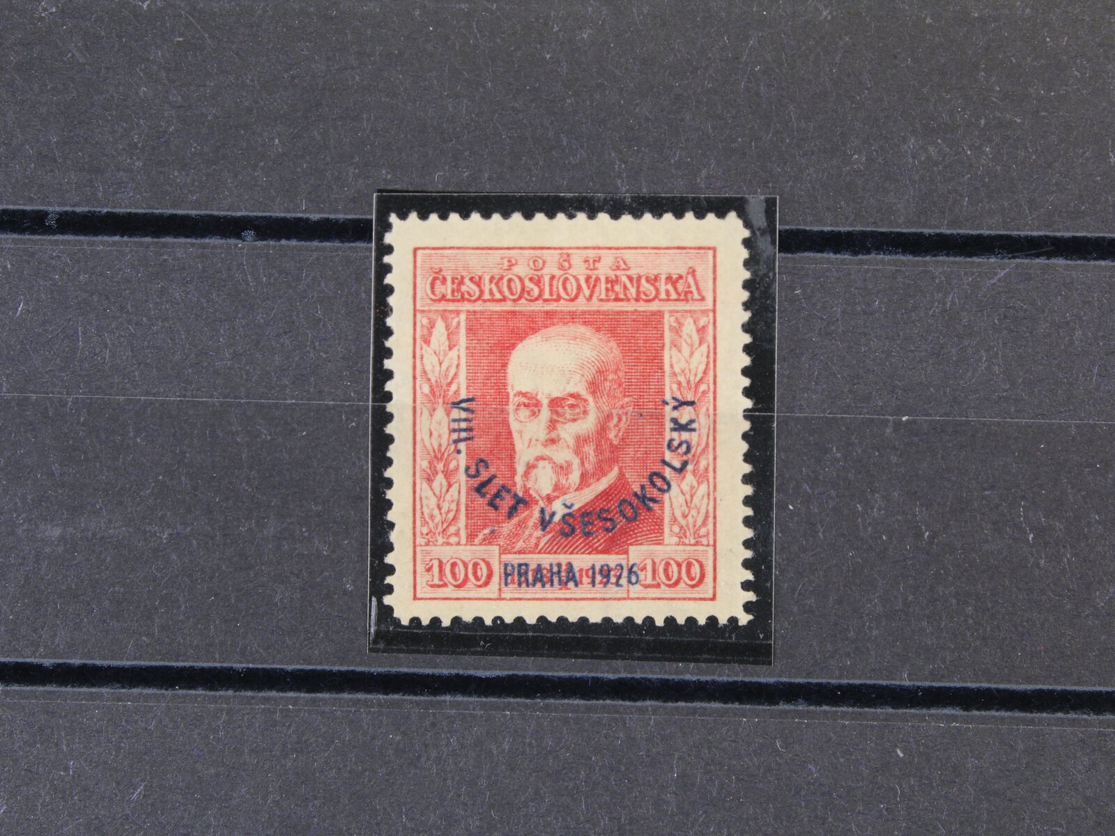 484 zn. č. 184 100h s falešným přetiskem VIII. VŠESOKOLSKÝ SLET PRAHA 1926, na zadní str. označeno FALSUM, ojedinělý vzácný výskyt 9000