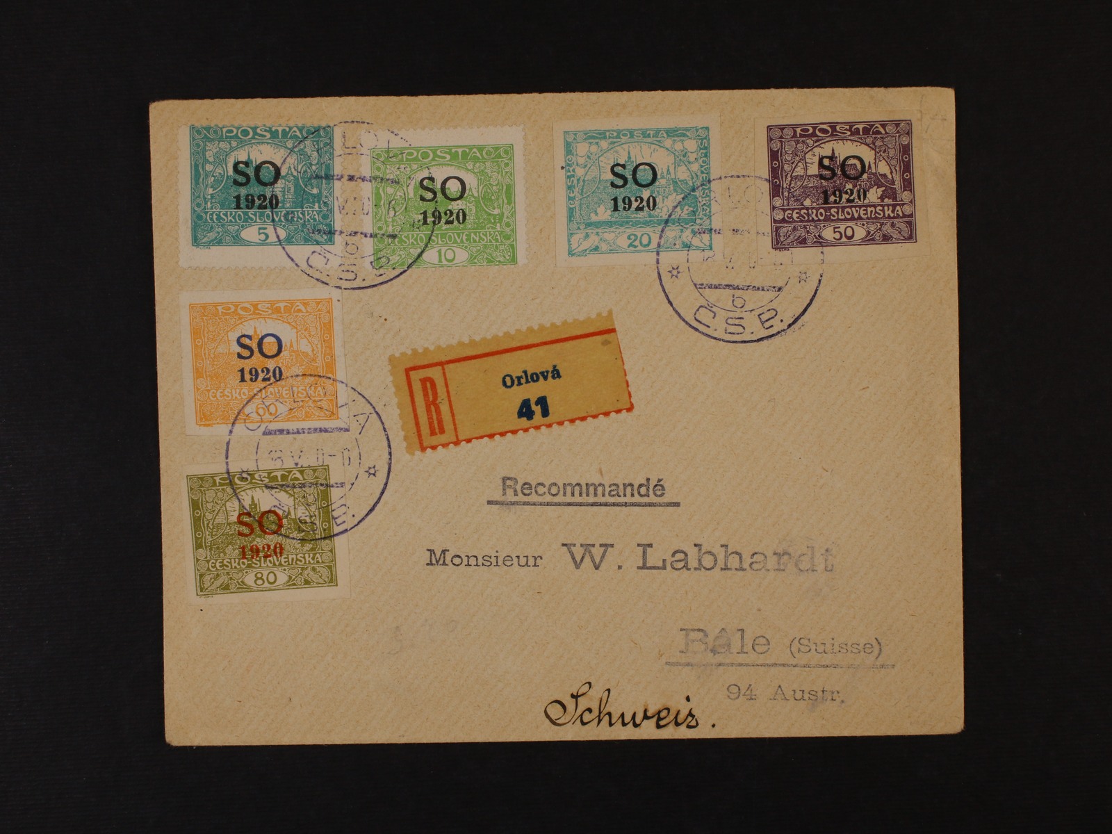807 R-dopis do Švýcarska frank. pestrou frankaturou, pod. raz. ORLOVÁ 18.5.20, přích. raz. BASEL 23.5.20, zajímavé 1000