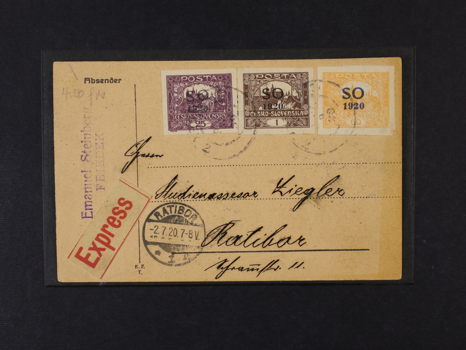 808 EXPRES KL do Ratiboře frank. zn. SO č. 1, SO 8, SO 14, pod. raz. FRIEDEK 2 30.6.20 + přích. raz. RATIBOR 2.7.20 1000