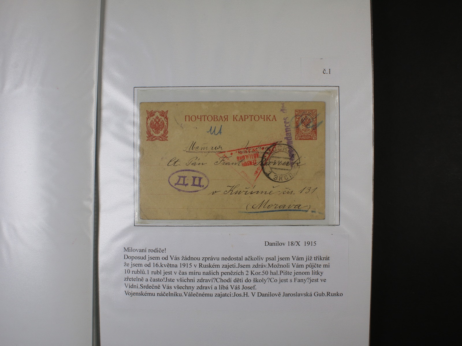 821 zajatecká pošta čs. vojáků z období 1. svět. války z let 1915 - 17 - sestava 25 ks celistvostí, zajímavá raz., cenzury, uloženo na listech s popisem v šedých šroubových deskách, zajímavé, k prohlédnutí 400