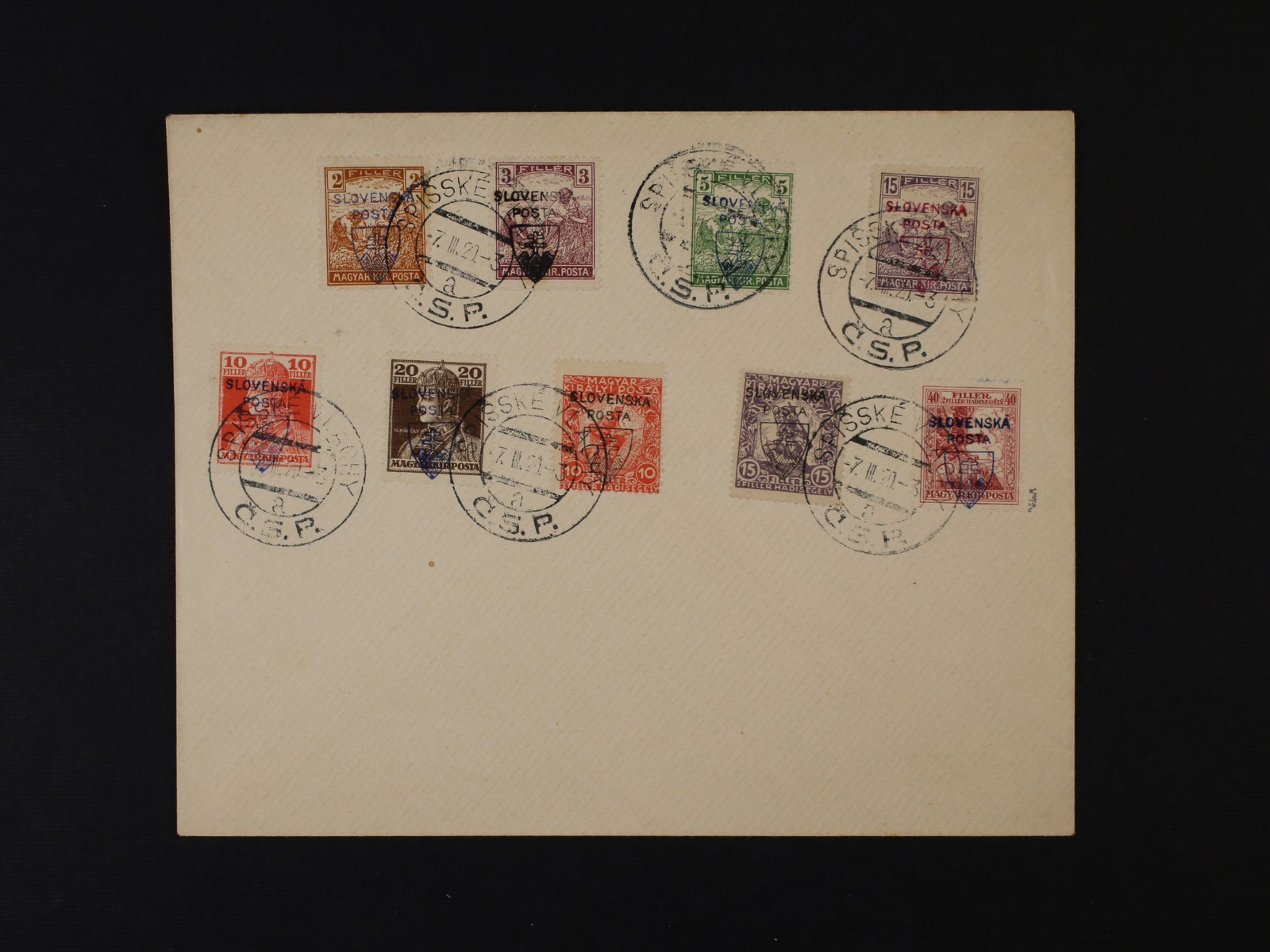 828 Jehličkův přetisk - obálka s vylepenými 9ti uherskými zn. s přetiskem v barvě modré, červené nebo černé, znehodnoc. DR SPIŠSKÉ VLACHY 7.3.21, zk. Vrba, kat. cca 45000 Kč 28000