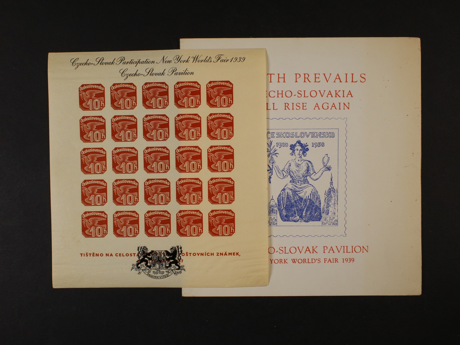 835 Exilový aršík č. 342-343 s černým přítiskem k výstavě New York 1939 s chybotiskem SBOVAK namísto SLOVAK s výstavním raz. 1. dne výstavy OPENING DAY CZECHOSLOVAK PAVILON 2000