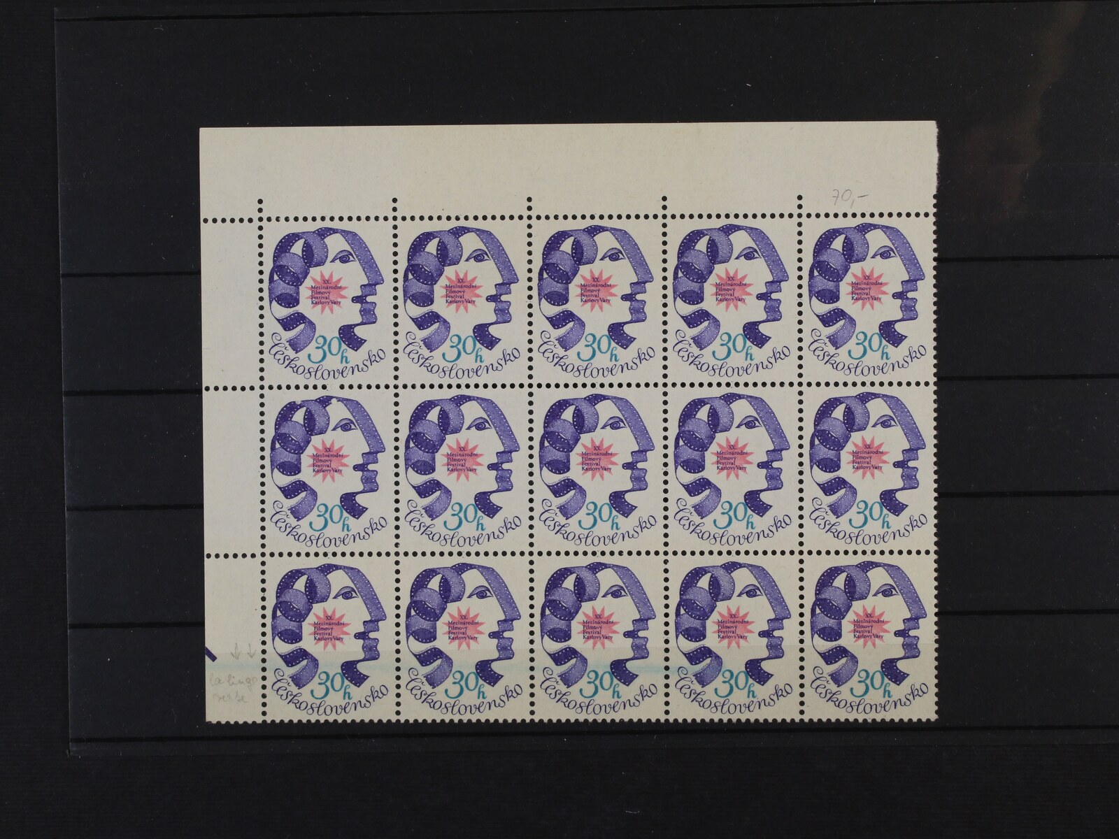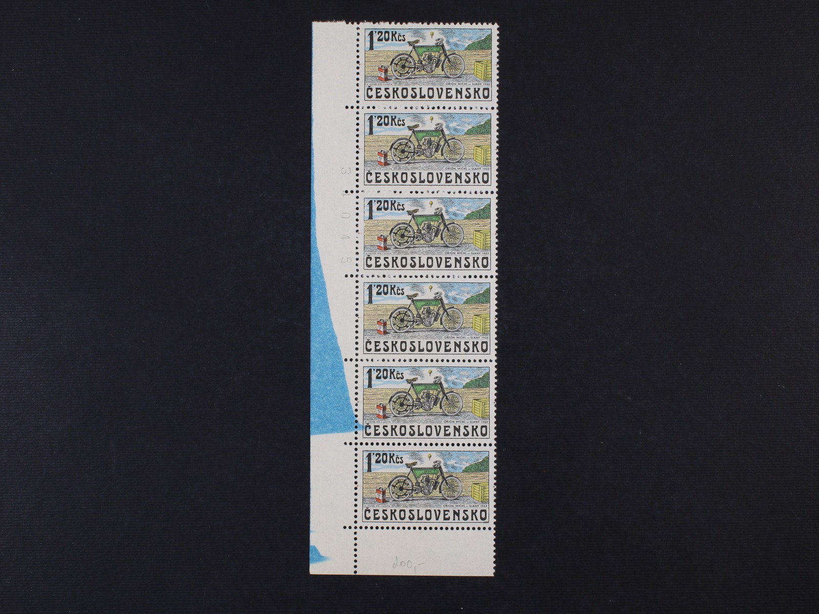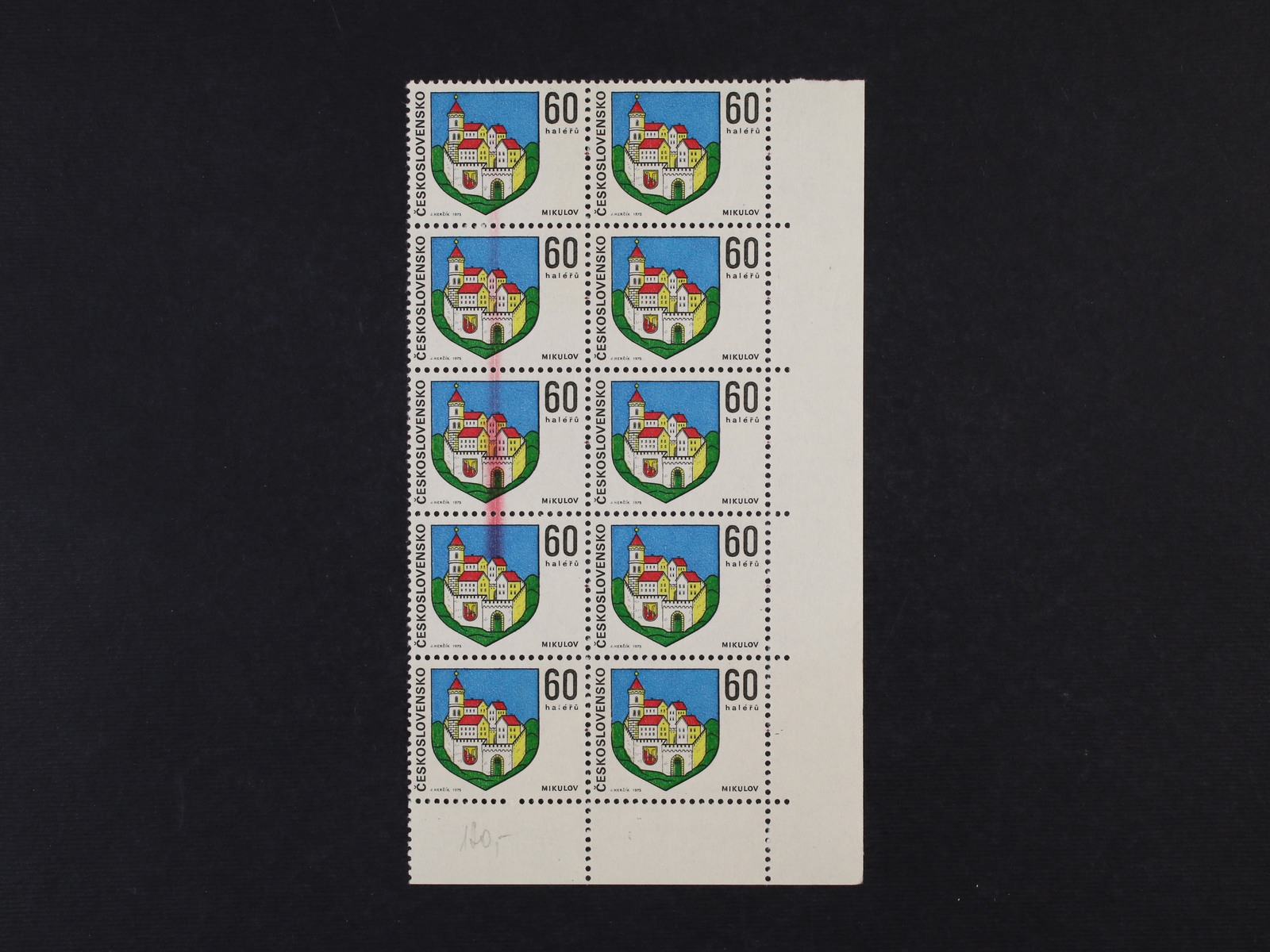1208 zn. č. 2158 svislá rohová šestipáska s VV - stěr modré barvy na okraji zasahující do známky 300