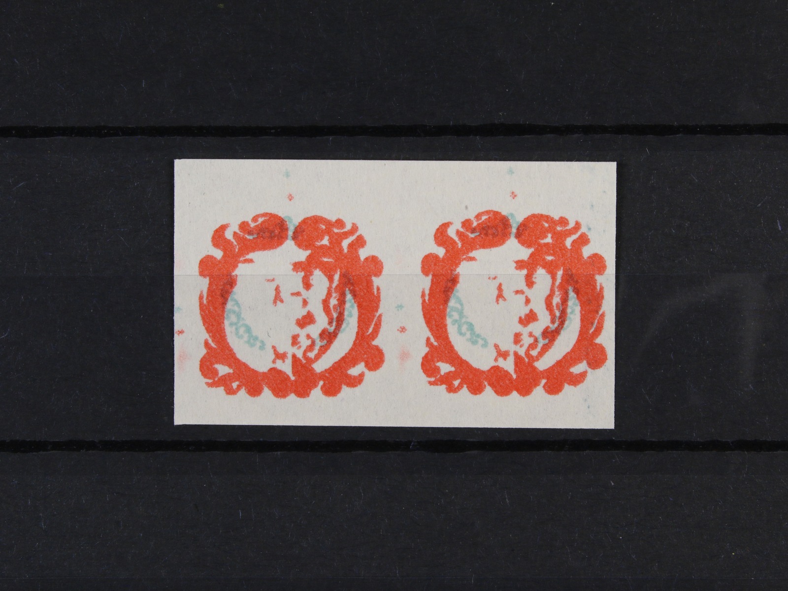 1231 zn. č. 2635 ve dvoupásce, nájezdová makulatura, tisk pouze modrou a červenou barvou, na zn. papíře s lepem, zk. Weissenstein 500