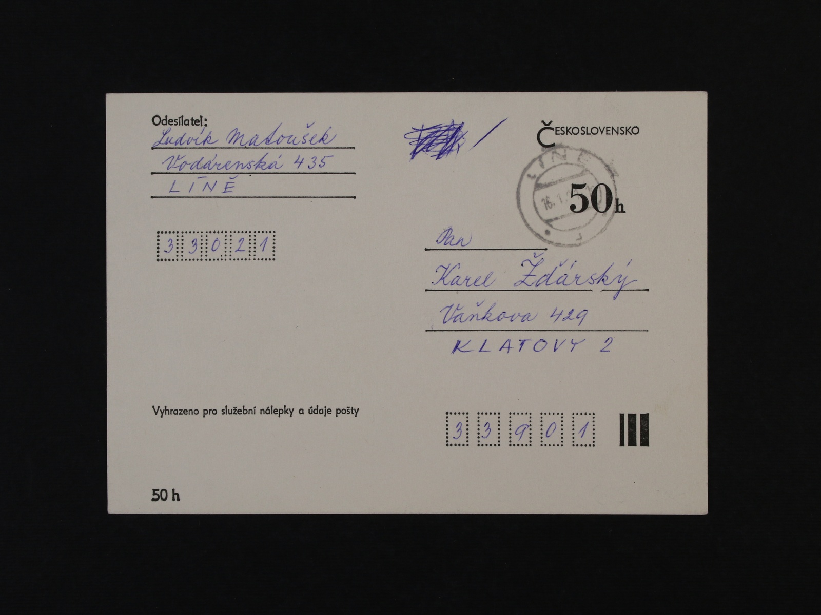 CDV č. 192 s kompletně vynechaným tiskem fialové barvy zaslaná do Klatov, pod. raz. LÍNĚ 16.1.81