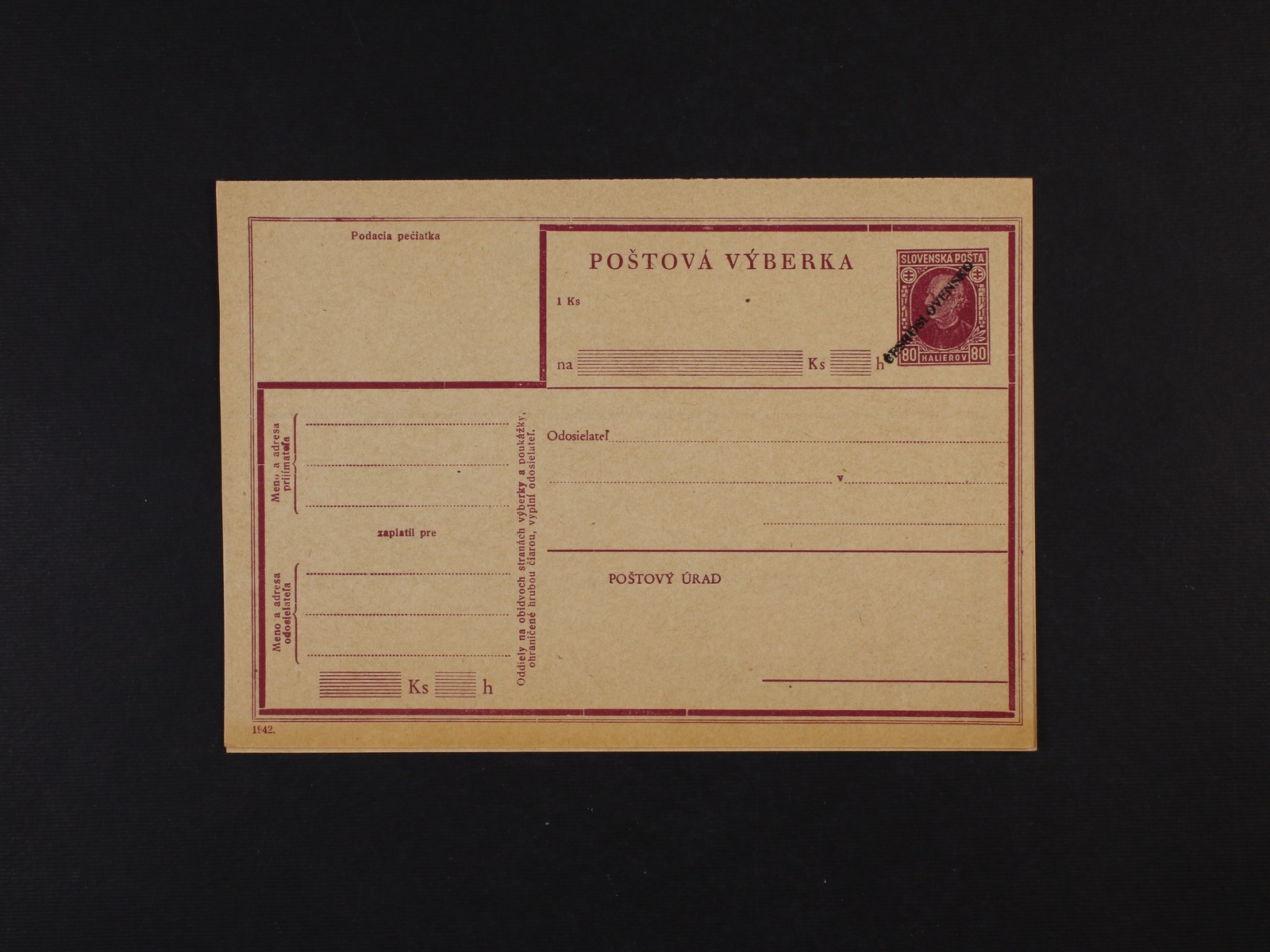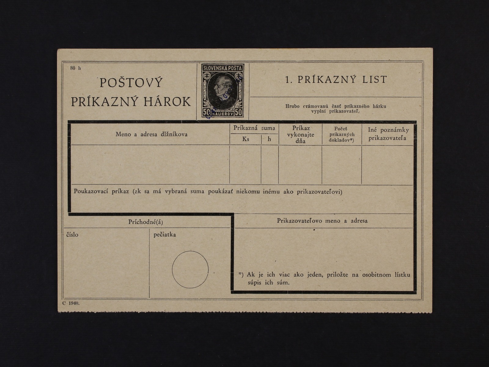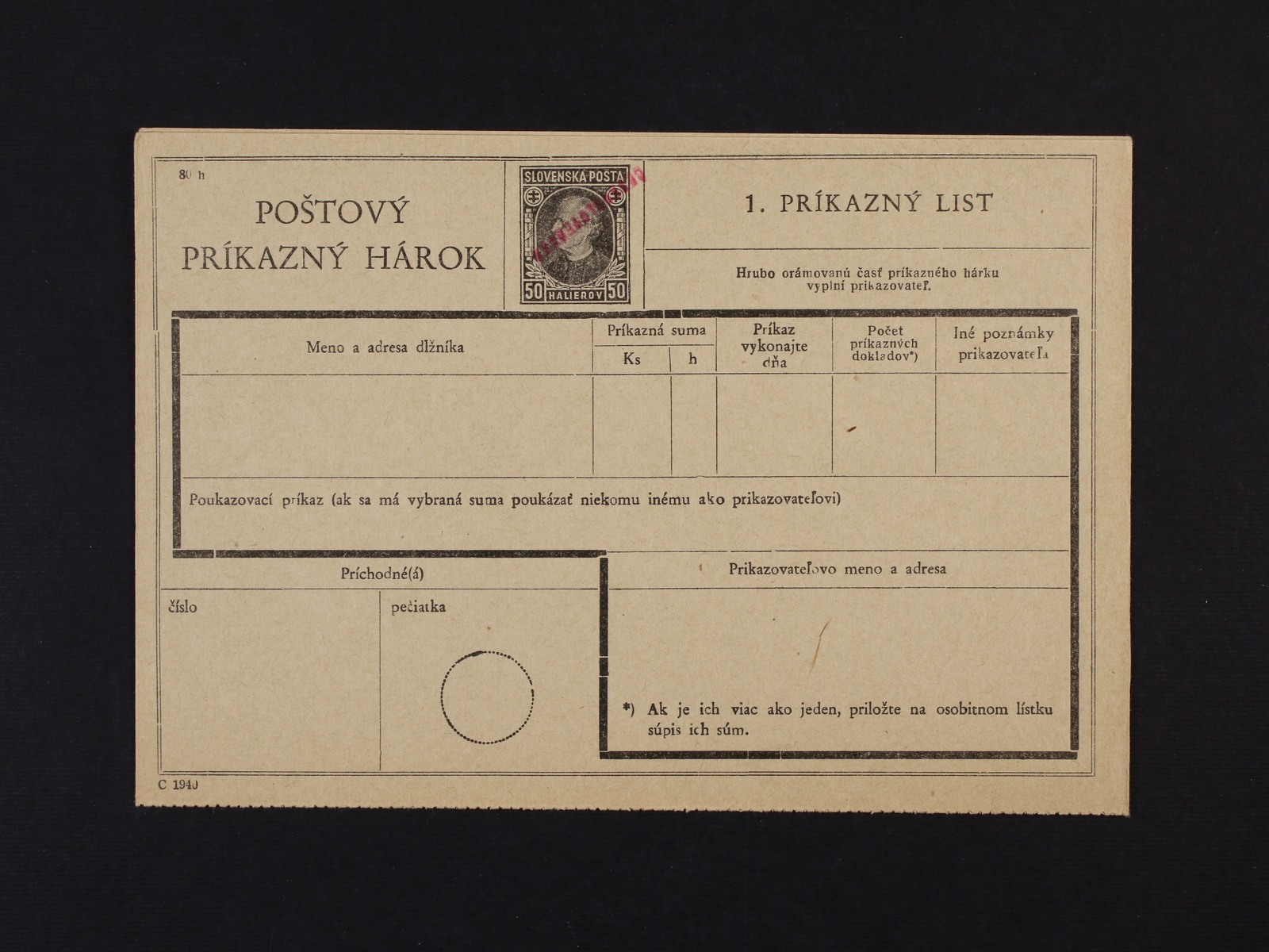 CPA č. 2.3.B Poštový príkazný hárok 50h Hlinka s ručním červeným přetiskem ČESKOSLOVENSKO, přeložený, nepoužitý