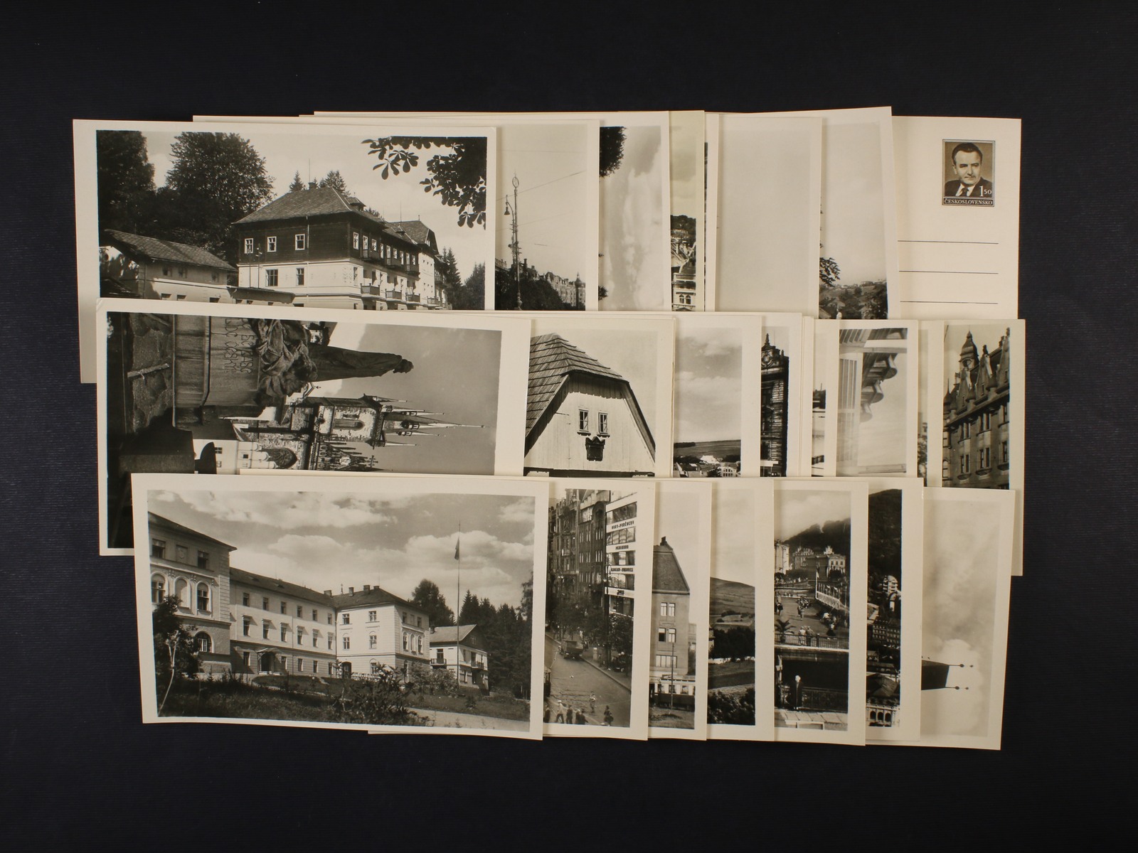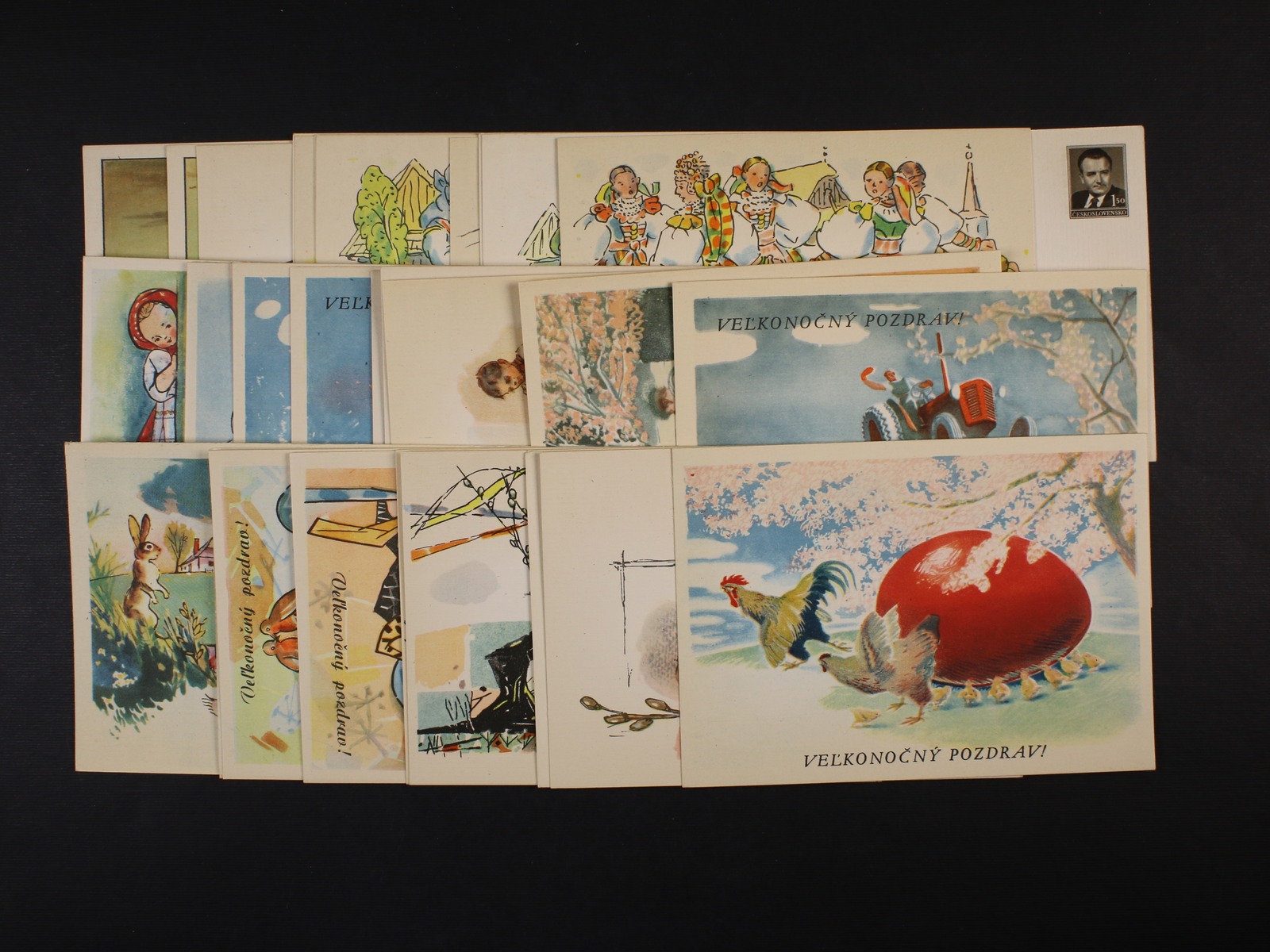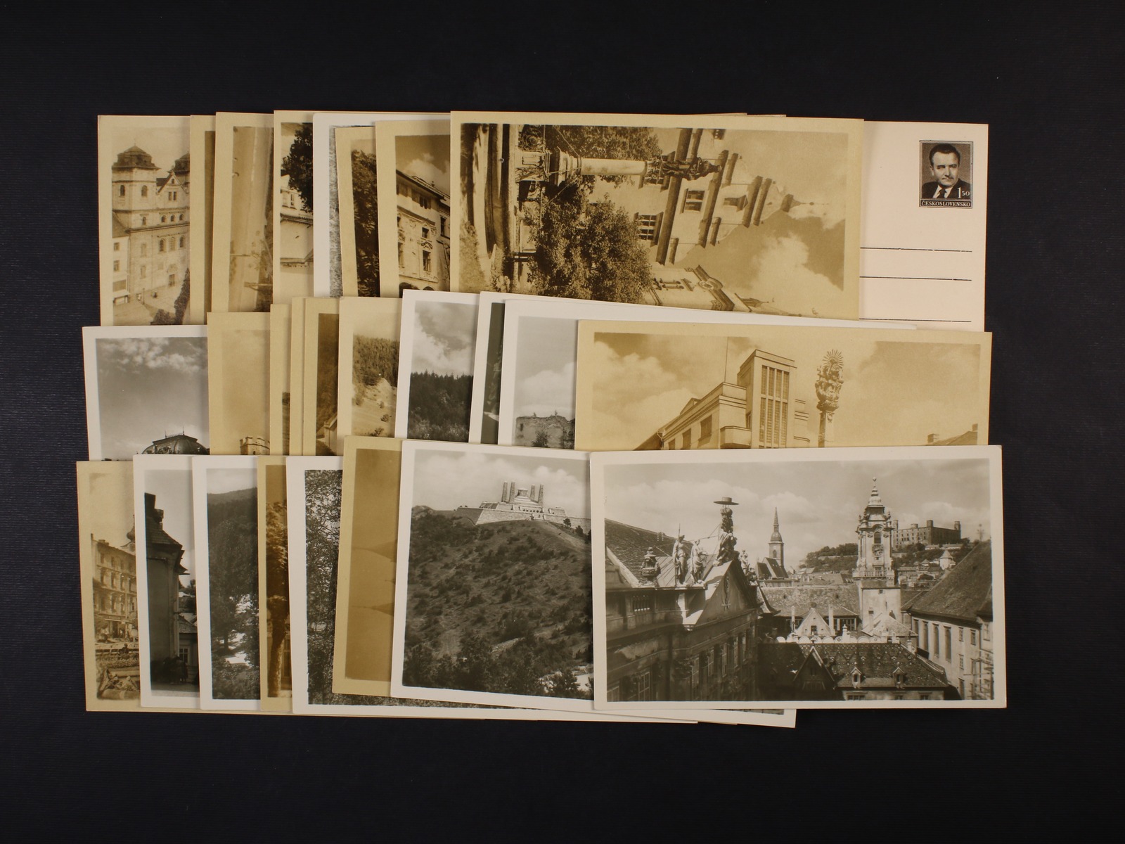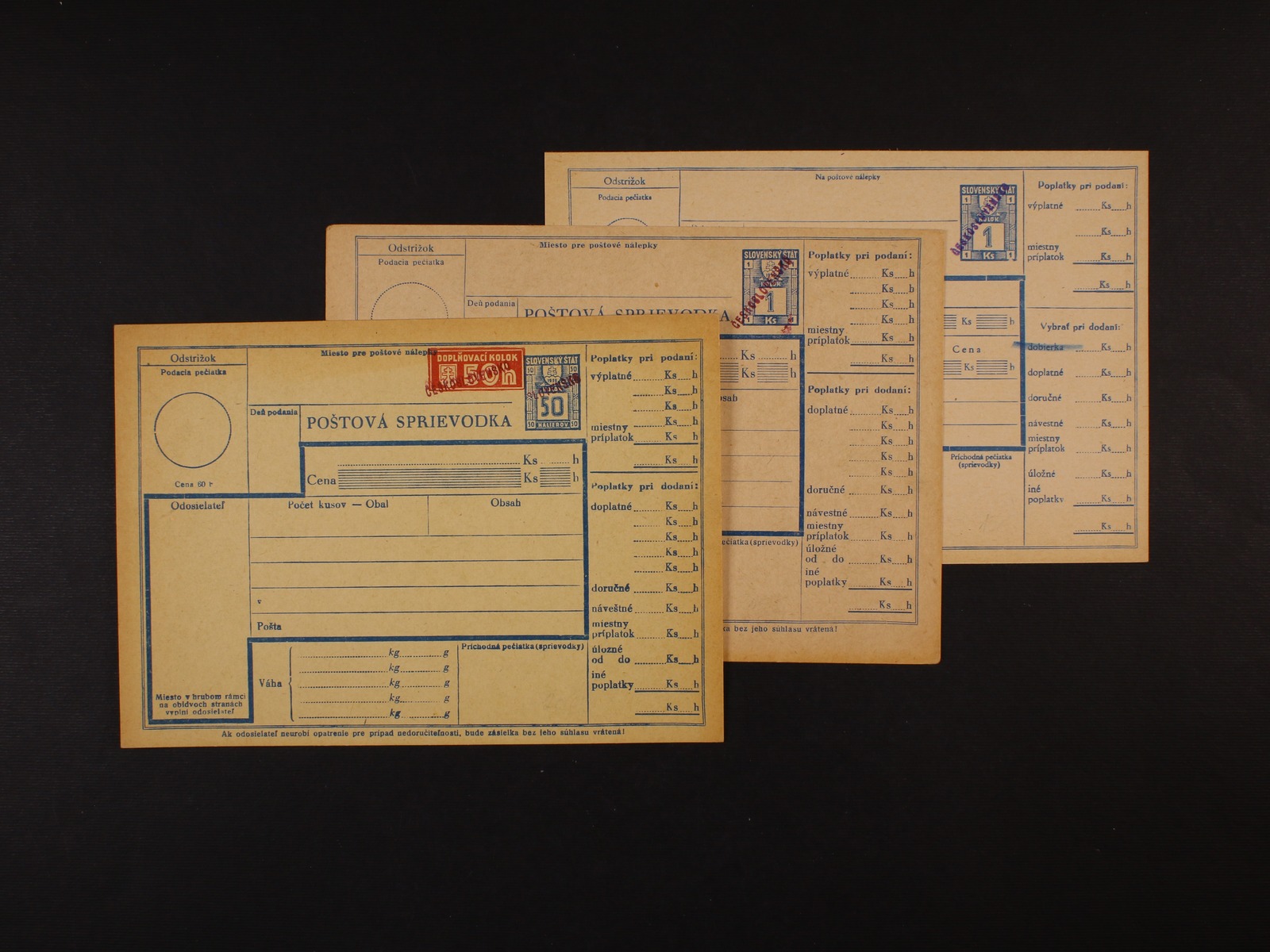 sestava 3 ks nepoužitých poštovních průvodek Slovenského štátu s natištěnými kolky 50h a 1Ks s ručním přetiskem ČESKOSLOVENSKO