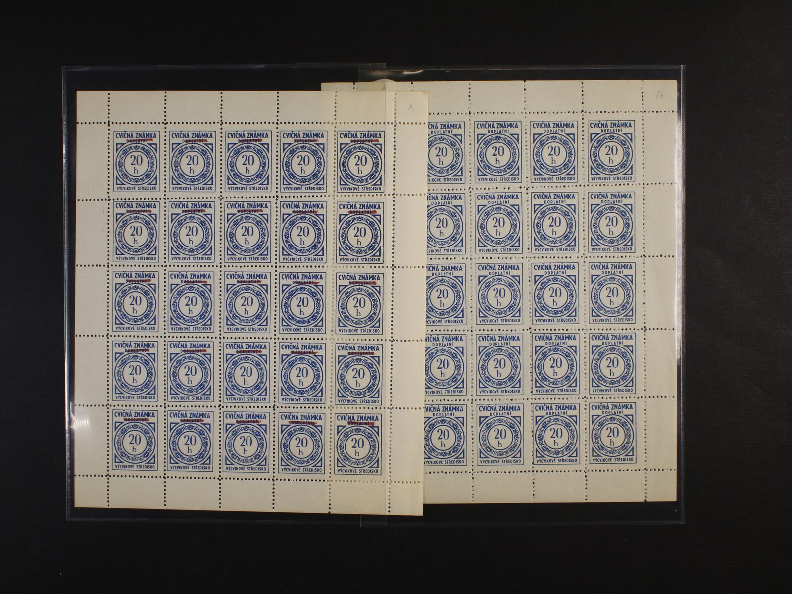 cvičné zn. 1954 - zn. D č. 1 20h modrá v kompl. 25ti-kusovém PA + dtto s ručně škrtnutým DOPLATNÍ, kat. cena min. 11000 Kč