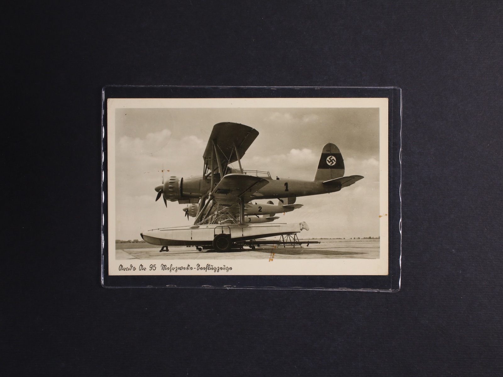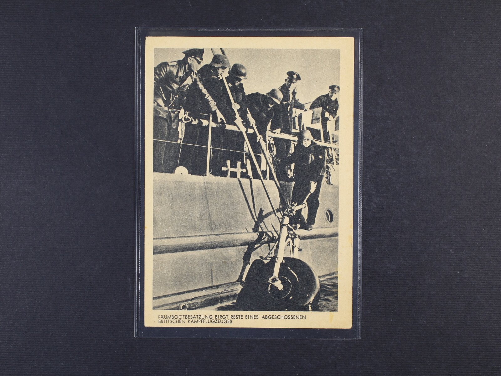 1402 jednobar. pohlednice zobrazující posádku minolovky vytahující zbytky britského sestřeleného letadla, nepoužitá, dobrá kvalita 260