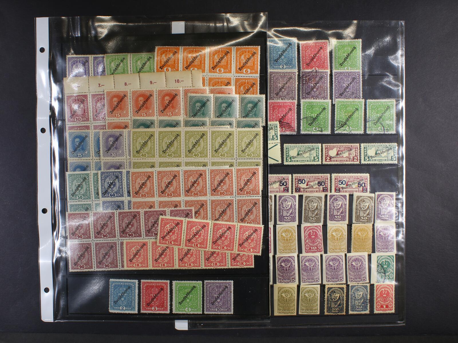 Rakousko - sbírka zn. z r. 1919 - 22, známky, kupony, čtyřbloky i větší bloky, různé VV, DV, převážně svěží, mj. zn. Mi. č. 228 - 242 (bez 232), převážně v 10ti-blocích, některé roztržené, dále zn. Mi. č. 243 - 6, různé barvy, zn. Mi. č. 268 A s VV příčná složka papíru (*), uloženo na výmětových deskách + 9 listů s popisem v Hewidkách, zajímavé k prohlédnutí