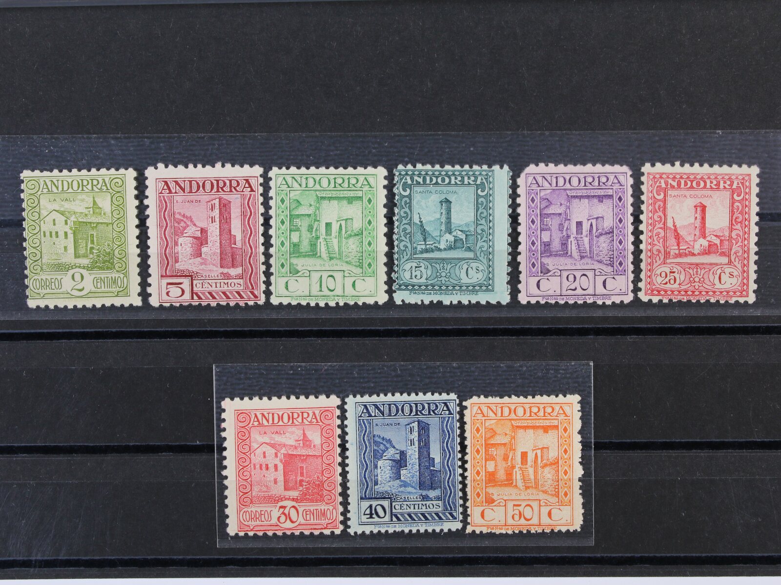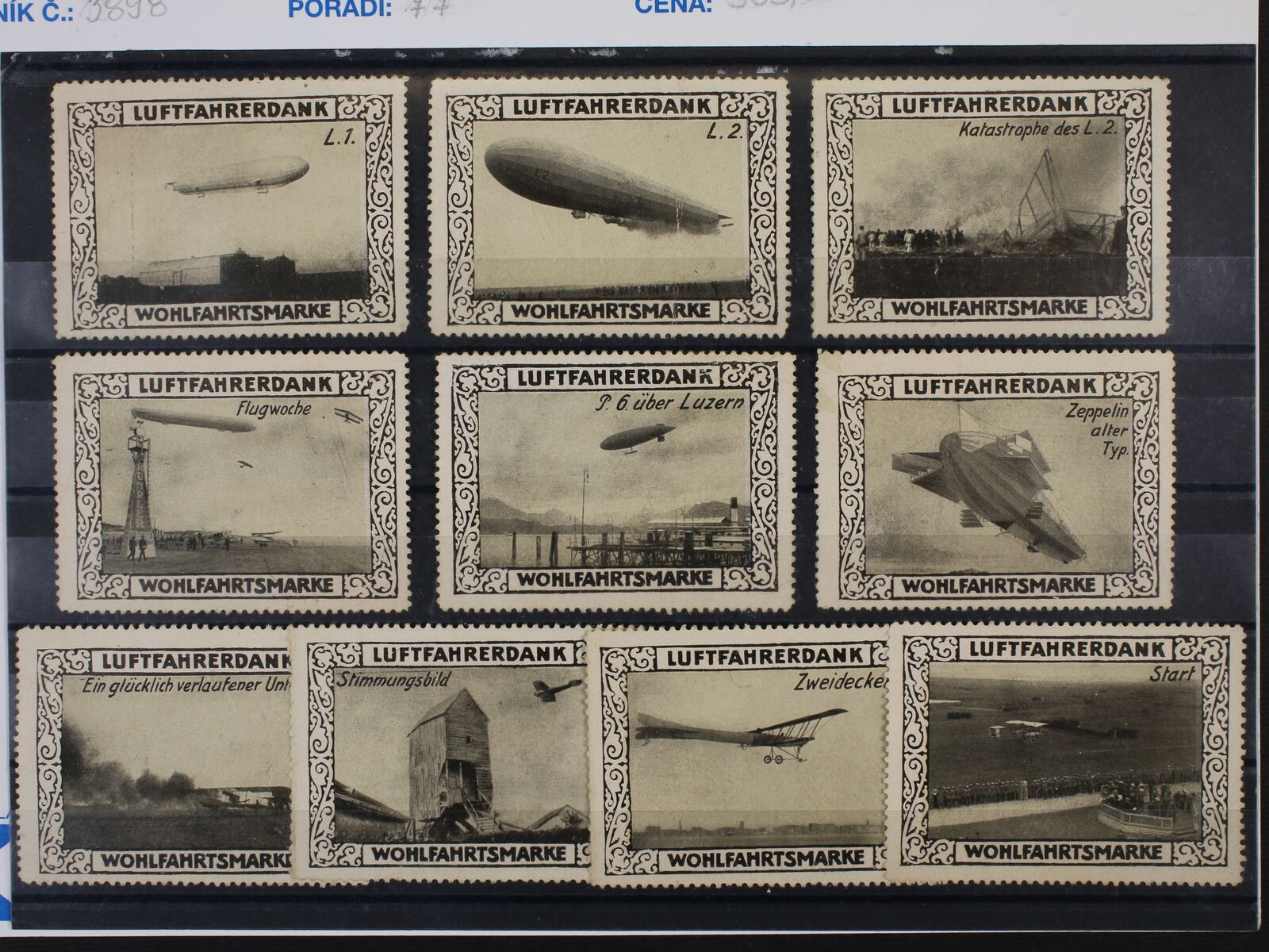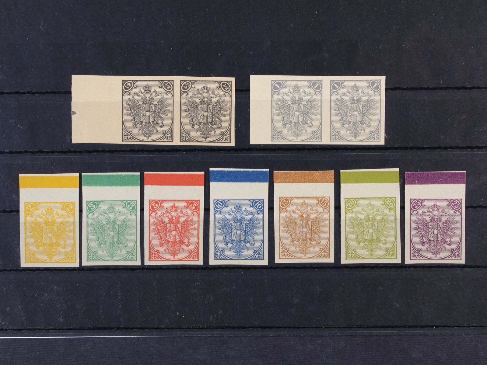 ZT zn. Mi. č. 1 + Mi. 2 ve dvoupáskách s pravým okrajem na karton. papíře a ZT zn. Mi. č. 3 - 9 s horními okraji a otiskem lišty na slabém papíře bez lepu