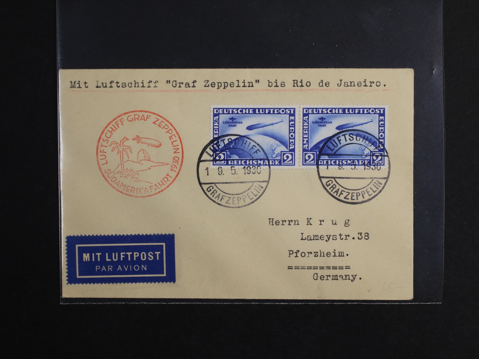 Německo - Zeppelin 1930, 1. SÜDAMERIKAFAHRT / dopis Sie.57E, vyfr. 2-páskou 2RM SÜDAMERIKAFAHRT, palubní raz., příchozí RIO DE JANEIRO; krásný malý dopis, kat. Sieger 900€