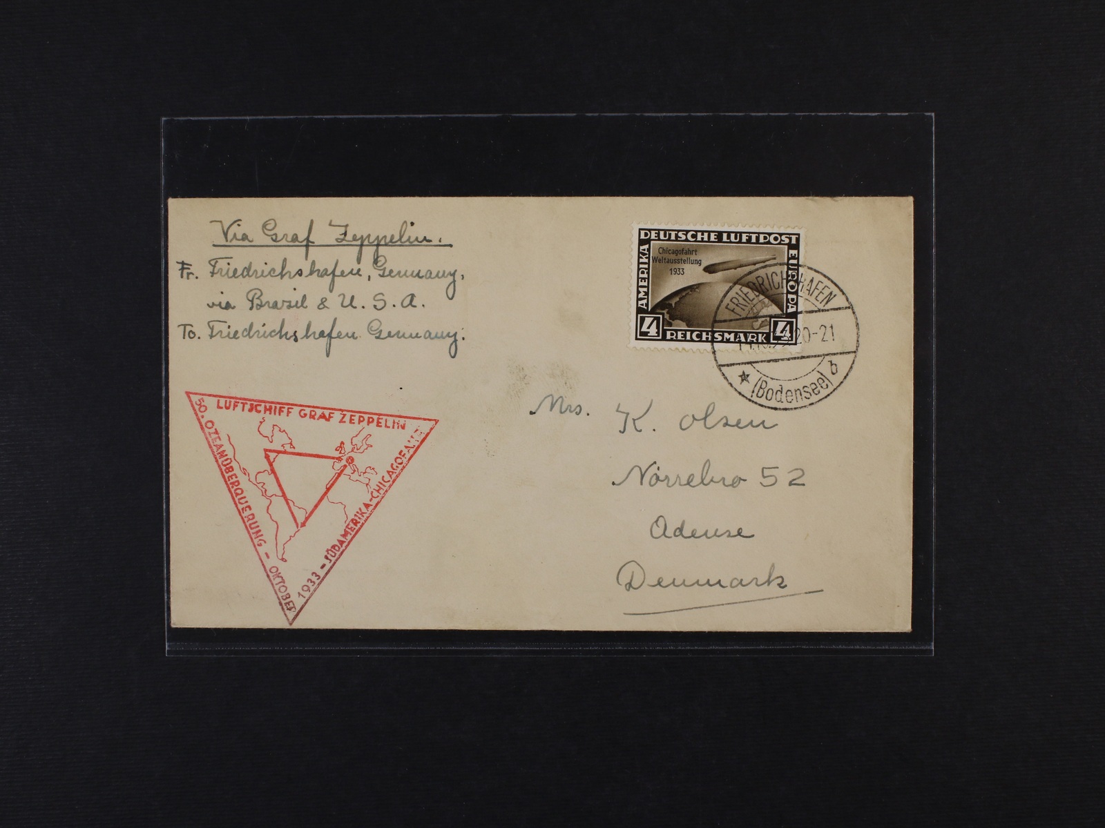 Německo - Zeppelin 1933, CHICAGOFAHRT / dopis vyfr. zn. 4RM, Sie. 238Cbb, let Friedrichshafen-Friedrichshafen, červené raz. 50. Ozeanüberquerung atd.; kat. Sieger 800 EUR