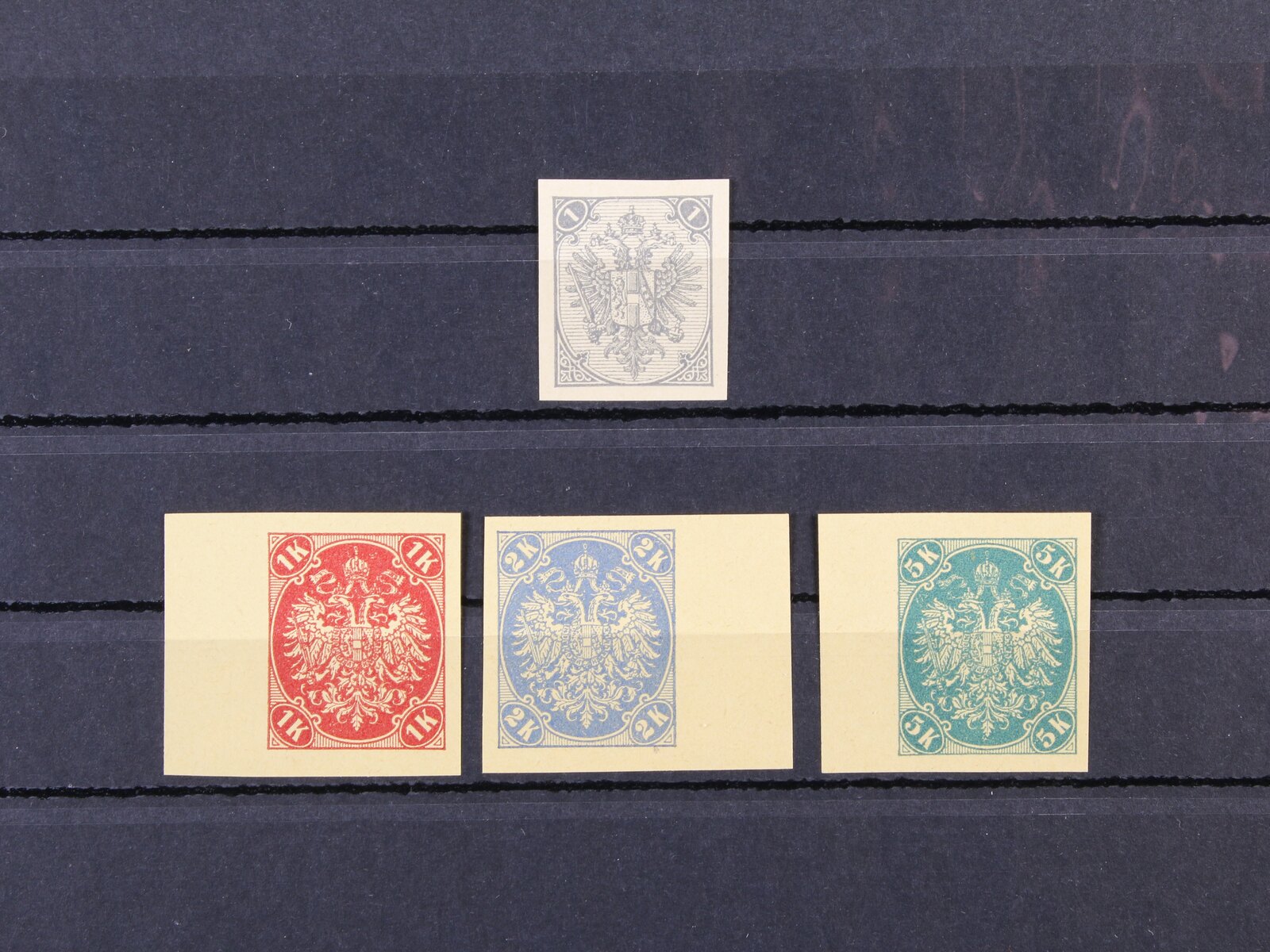ZT zn. Mi. č. 2 1kr šedá na kousku silného papíru a ZT zn. Mi. č. 21 - 23 v orig. barvách na nažloutlém papíře s okraji