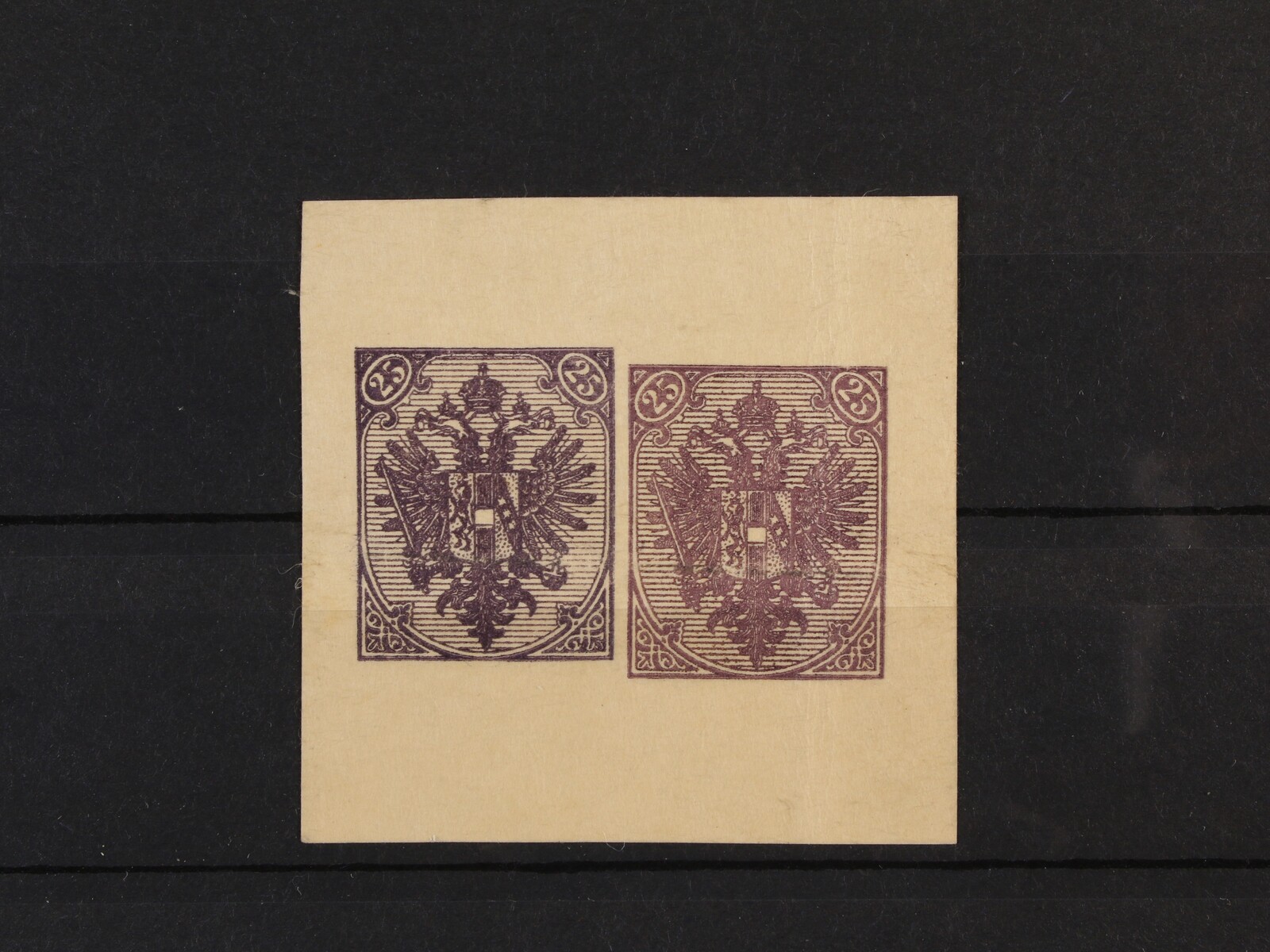 ZT zn. Mi. č. 9 25kr v barvě fialové ve dvou bar. odstínech, na zadní str. tisk zn. Mi. 3 2kr v červené barvě se škrtem modré tužky na karton. papíru